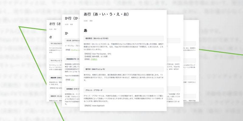 ご存じでしたか?Titan FX では、多岐に渡る金融用語を分かり易く解説した、弊社オリジナルの用語集をご用意しております。この度、これまでにお客様から寄せられたご質問などを元に、新たに150語以上の取引やシステム関連、テクニカルの用語などを追加しました。豊富なラインアップの用語集を、是非とも日々のお取引にご活用下さい。