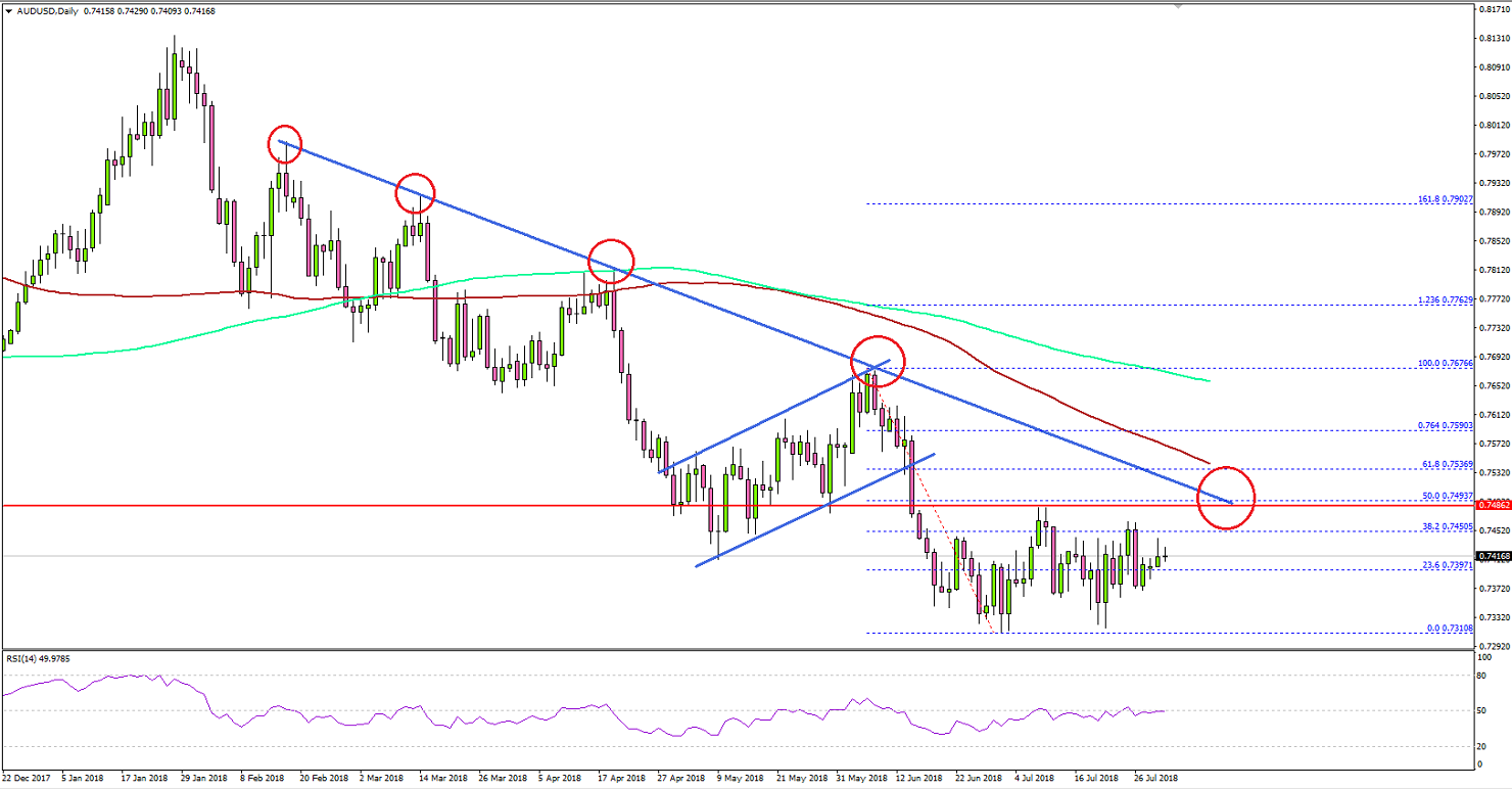 The Aussie Dollar remained in a major downtrend from the 0.7670 swing high against the US Dollar. The AUD/USD pair recently formed support near 0.7310 and recovered, but upsides remained capped.AUDUSD Technical Analysis Aussie Dollar US DollarLooking at the daily chart, the pair recovered above the 23.6% Fibonacci retracement level of the last decline from the 0.7670 swing high to 0.7310 swing low. However, the previous support area near 0.7490-0.7500 acted as a resistance.Additionally, the 50% Fibonacci retracement level of the last decline from the 0.7670 swing high to 0.7310 swing low also acted as a resistance. More importantly, there is a crucial bearish trend line in place with resistance at 0.7500 on the same chart.Therefore, it won’t be easy for the Aussie dollar to break the 0.7490 and 0.7500 resistance levels. Above 0.7500, the 100-day simple moving average (red) is positioned at 0.7540. As long as AUD/USD is below 0.7500 and the 100-day SMA, it may perhaps either consolidate or move down towards 0.7200.On the flip side, a close above 0.7500 and the 100-day SMA could push the pair in a positive zone towards the 0.7600 and 0.7700 levels in the medium term.Recently in the US, the Personal Income for June 2018 was released by the Bureau of Economic Analysis, Department of Commerce. The market was looking for a 0.4% rise the personal income compared with the previous month.The actual result was in line with the forecast and similar to the last reading. Looking at the Core Personal Consumption Expenditure in June 2018, there was a rise of 1.9%, less than the forecast of 2%.Overall, AUD/USD is facing an uphill task near 0.7500. However, today’s fed rate decision could ignite swing moves in pairs like EUR/USD, GBP/USD, AUD/USD, USD/JPY and NZD/USD.