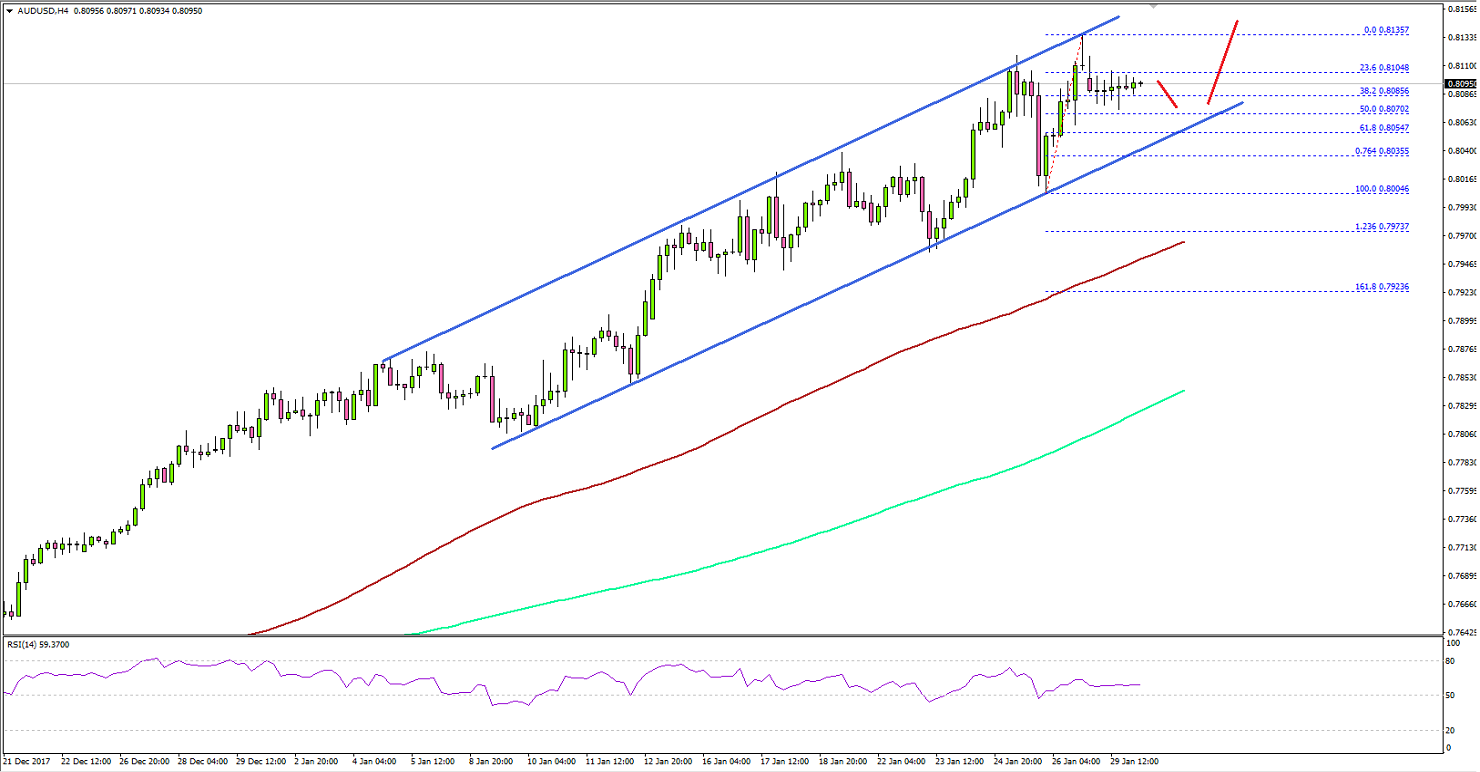 The 4-hours chart of AUD/USD clearly points to a major uptrend from the 0.7600 swing low. The pair climbed higher and broke many resistances such as 0.7800, 0.7880, 0.7900 and 0.8000.The upside move was very strong as buyers were able to push the pair above the 0.8100 level. A new year high was formed at 0.8135 from where a downside correction was initiated. It broke the 23.6% Fib retracement level of the last wave from the 0.8004 low to 0.8135 high.Looking at the chart, it seems like there is a crucial ascending channel forming with current support at 0.8060. On the downside, an initial support is around the 50% Fib retracement level of the last wave from the 0.8004 low to 0.8135 high at 0.8070.Therefore, a strong support is forming around 0.8060-0.8070. Below the mentioned 0.8060, the pair may test the 0.8000 handle, which is the most important support and a buy zone.On the upside, an initial hurdle for buyers is at 0.8135-40. Above 0.8140, the pair may accelerate towards the 0.8200 level. The overall price structure is bullish as long as AUD/USD is above 0.8000.In general, the recent rise in AUD/USD is linked to the US Dollar weakness. Other major pairs such as EUR/USD and GBP/USD also gained heavily. However, there are now signs of trend exhaustion and traders need to be careful chasing this rally going forward.