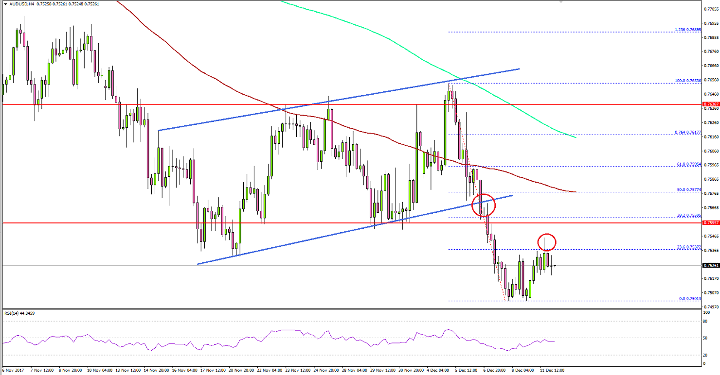 There was a start of a major downside move from 0.7650 where the pair faced a strong resistance and the 200 simple moving average (green, 4-hour). The pair tumbled and broke a key ascending channel at 0.7570 on the 4-hours chart.The pair is now trading well below 0.7600 and the 100 simple moving average (red, 4-hour). The recent low was formed at 0.7503 before a recovery was initiated. Buyers managed to push the pair a few pips higher, but they are likely to face many hurdles starting from 0.7540.The mentioned 0.7540 is around the 23.6% Fib retracement level of the last drop from the 0.7653 high to 0.7503 low. The most important resistance on the upside is near 0.7575 and the 100 SMA. The stated 0.7575 resistance is the 50% Fib retracement level of the last drop from the 0.7653 high to 0.7503 low.Therefore, any recoveries toward 0.7550 and 0.7575 will most likely face a strong selling interest. On the downside, a break of the 0.7500 support could accelerate decline towards 0.7440.