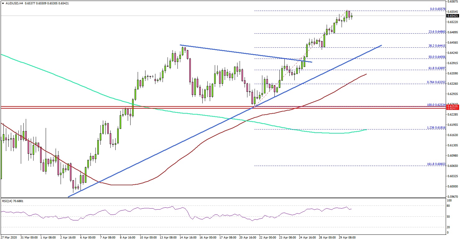 - A crucial bullish trend line is forming with support near 0.6430 on the 4-hours chart.