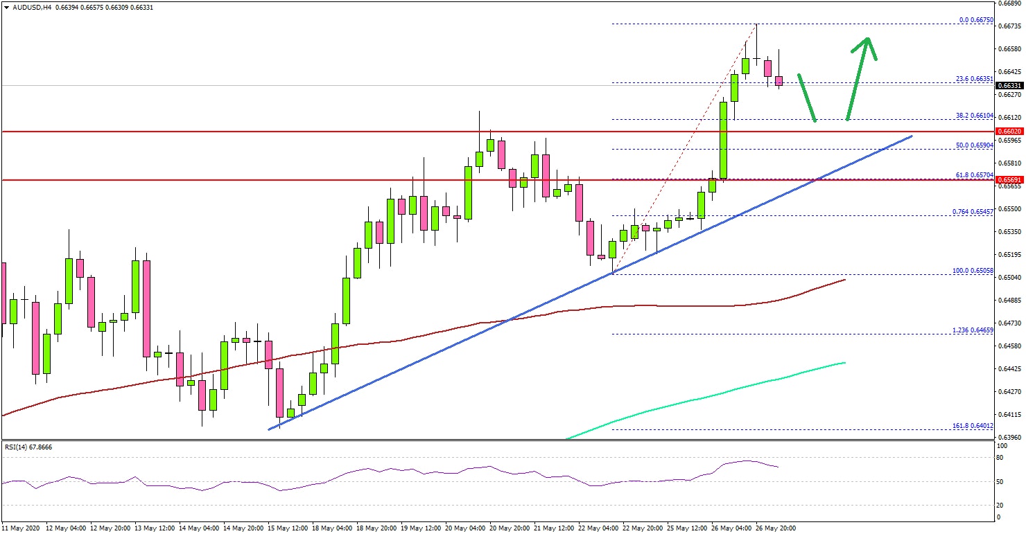 The pair was able to surpass the 0.6590 and 0.6600 resistance levels. It even climbed above 0.6640 and traded to a new multi-week high above 0.6650. The current price action is positive and the pair is likely to continue higher towards the 0.6700 level.