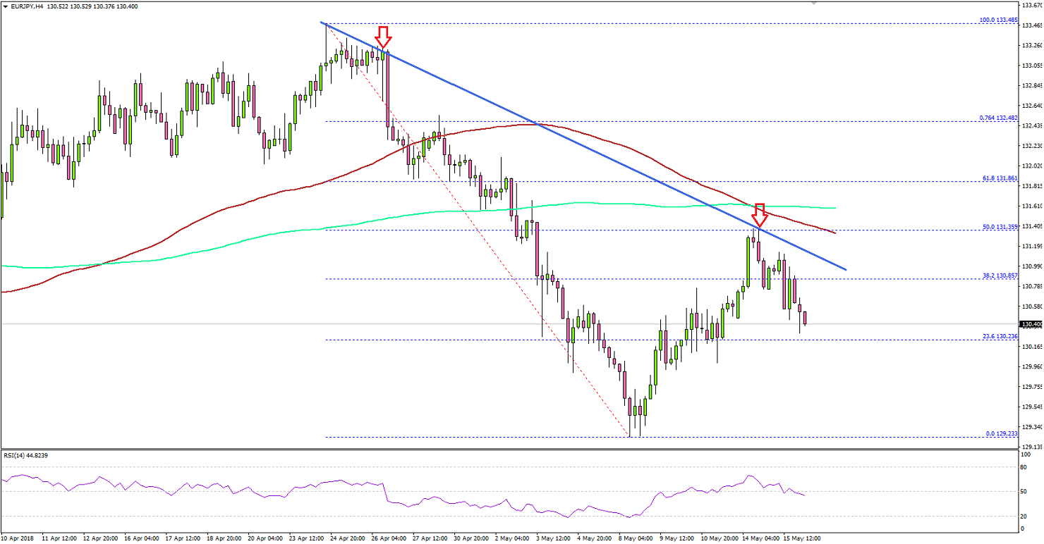 The Euro declined heavily earlier during the start of May 2018 against the Japanese Yen. The EUR/JPY pair broke 132.00 and 130.00 support levels before finding buyers just above 129.20.EURJPY Technical Analysis Euro Japanese YenA low was formed at 129.23 before the pair started an upside correction. It moved higher and broke the 130.00 resistance, and even cleared the 23.6% Fib retracement level of the last decline from the 133.48 high to 129.23 low.It gained bullish momentum above 131.00, but buyers faced a major hurdle just below 131.50. The 50% Fib retracement level of the last decline from the 133.48 high to 129.23 low acted as a resistance.Moreover, there is a major bearish trend line in place with resistance near 131.30 on the 4-hour chart of EUR/JPY. Moreover, the 100 (red) and 200 (green) simple moving averages (4-hour) are near 131.50/60.Therefore, a break above the 131.30-50 resistance won’t be easy. If buyers succeed, the pair may rise towards 132.00 and 133.00 in the near term. On the downside, supports are at 130.20 and 130.00.Recently, the Euro Area Gross Domestic Product for Q1 2018 (Prelim) was released by the Eurostat. The market was looking for a growth rate of 0.4% compared with the previous quarter.The actual result was similar, and the yearly change was also in line with the forecast of 2.5%. The report mentioned that: