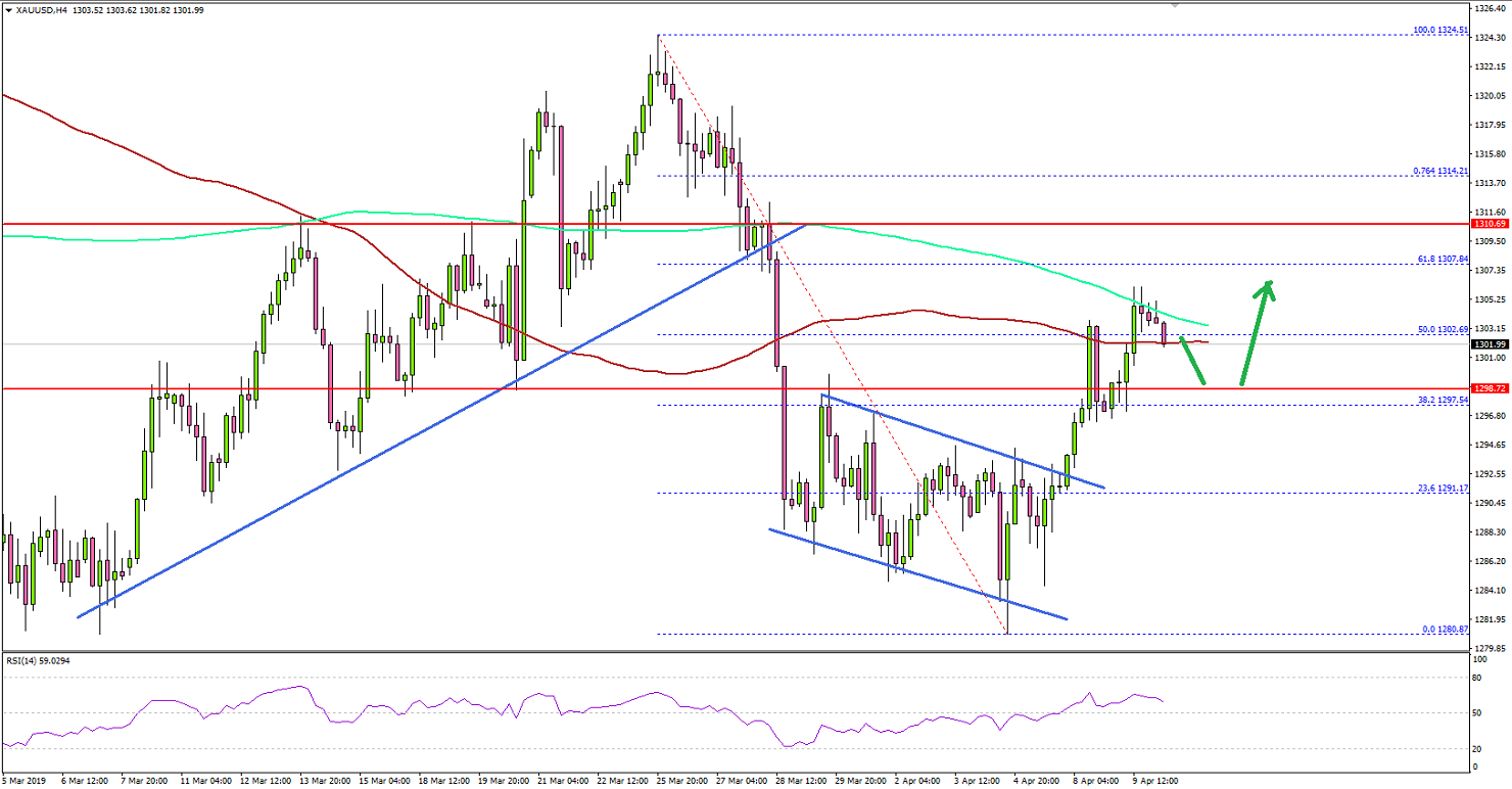 Moreover, there was a break above a crucial decliningchannel with resistance at $1,292 on the same chart, opening the doors for moregains. Recently, the price broke the $1,300 resistance, the 100 simple movingaverage (red, 4-hours) and the 50% Fib retracement level of the last declinefrom the $1,324 high to $1,280 low.