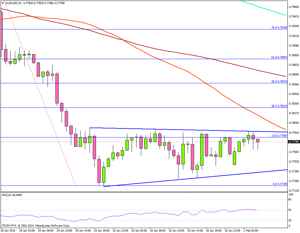 Australian AIG Performance Mfg. IndexEarlier during the Asian session, there was an important release lined in Australia. The TD Securities Inflation was also was released by The University of Melbourne - Faculty of Economics and Commerce. The outcome was on the positive side, as the AIG performance index increased by 2.1 points to 49.0 points in January 2015 on the seasonally adjusted basis. However, it was below the 50 level, which means contraction. On the other hand, the report highlighted that stable conditions across the manufacturing sector were noted this past month. The key point was the fact that the manufacturing exports expanded for the second month, and manufacturers increased their stock levels in January. Moreover, the input prices declined by 2.9 points to 67.3 points. The most important one was the food, beverages and tobacco sub-sector’s index, which rose by 2.5 points to 62.9.AIG IndexTechnical AnalysisThe AUDUSD pair was not affected much after the release, but in fact was seen struggling around the 0.7800 resistance area. There is a contracting triangle forming on the hourly chart, which might act as a catalyst for the pair in the near term. Moreover, the triangle resistance trend line is also coinciding with the 23.6% fib retracement level of the last drop from the 0.7895 high to 0.7719 low. Moreover, the 55 hourly moving average is also sitting just above the triangle. So, there is a major barrier around the 0.7800 area.AUDUSD 02.02.2015On the downside, the triangle support is around 0.7740, followed by the last low of 0.7720.US ISM Manufacturing PMILater during the NY session, the US Institute for Supply Management (ISM) Manufacturing Index will be released. The forecast is slated for no change in the index and is expected to stay at 55.5 in January 2015. Moreover, the US Manufacturing Purchasing Managers Index (PMI) will also be published by the Markit Economics. Let us see how the outcome affects the US and Aussie dollar moving ahead.