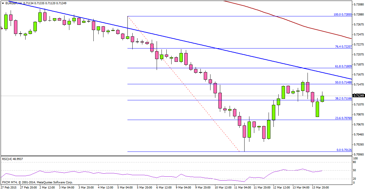 When we consider the yearly change, then the Rightmove House Price rose by 5.4% in March, compared to the last gain of 6.6%. The report stated that “the average new seller asking price just £30 below June 2014 record as high demand reduces the impact of tighter lending controls introduced in the April 2014 Mortgage Market Review”. Moreover, the number of newly-listed properties increase by around 3.2% in March 2015, compared to last month.Technical AnalysisAs mentioned, the EURGBP pair recently fell close to the 0.70 support area where the Euro buyers just managed to hold the downside. The pair is currently attempting to make a move back higher, but there is a bearish trend line on the 4 hour chart, which is likely to act as a resistance for the pair.