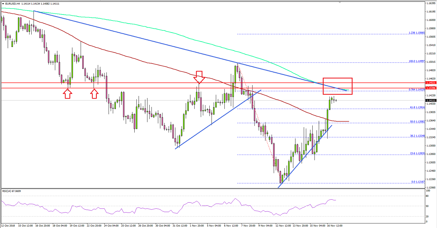 Looking at the 4-hours chart, the pair gained traction above the 1.1320 resistance and the 50% Fib retracement level of the last decline from the 1.1500 swing high to 1.1215 low. More importantly, the pair settled above the 1.1350 resistance and the 100 simple moving average (red, 4-hours). However, the pair is now approaching a solid resistance near the 1.1460 level, which was a support earlier and now it could stop the current upward move.Moreover, there is a key connecting bearish trend line in place with resistance at 1.1460 on the same chart. The same trend line is positioned along with the 200 simple moving average (green, 4-hours).Finally, the 76.4% Fib retracement level of the last decline from the 1.1500 swing high to 1.1215 low is around the 1.1440 level. Therefore, the 1.1460 resistance zone is very crucial. A successful break above the trend line, 200 SMA, and the 1.1460 resistance will most likely clear the path for more gains in the near term.Alternatively, if the pair fails to settle above the 1.1460 resistance, it could start a fresh decline. An initial support is near the 1.1350 level and the 100 SMA. Besides, there is a major bullish trend line in place with support at 1.1350.Below the trend line and 1.1350, the pair could drop heavily towards the 1.1300 and 1.1280 levels.