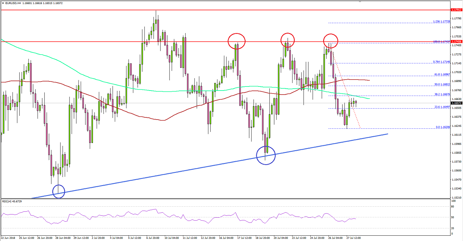 Looking at the 4-hours chart, it seems like the 1.1740-50 resistance is a crucial barrier for buyers. It acted as a resistance on many occasions and prevented an upside break towards 1.1800.The dip was strong as the pair broke the 1.1700 support and settled below the 100 simple moving average (red, 4-hours). The pair traded as low as 1.1620 and is currently consolidating losses.An initial resistance is near the 50% Fibonacci retracement level of the last decline from the 1.1743 high to 1.1620 low. Above this, the pair must clear the 1.1700 resistance and the 100 SMA to revisit the 1.1740 resistance.Finally, a successful close above the 1.1740-50 resistance zone may well push the price towards 1.1800. On the downside, there a major bullish trend line in place with support at 1.1620 on the same chart. Should there be a break below this, EUR/USD could move into a bearish zone towards 1.1550.Recently in the US, the Gross Domestic Product for Q2 2018 (Prelim) was released by the US Bureau of Economic Analysis. The market was looking for a rise of 4.1% in the GDP, more than the last +2.0%.