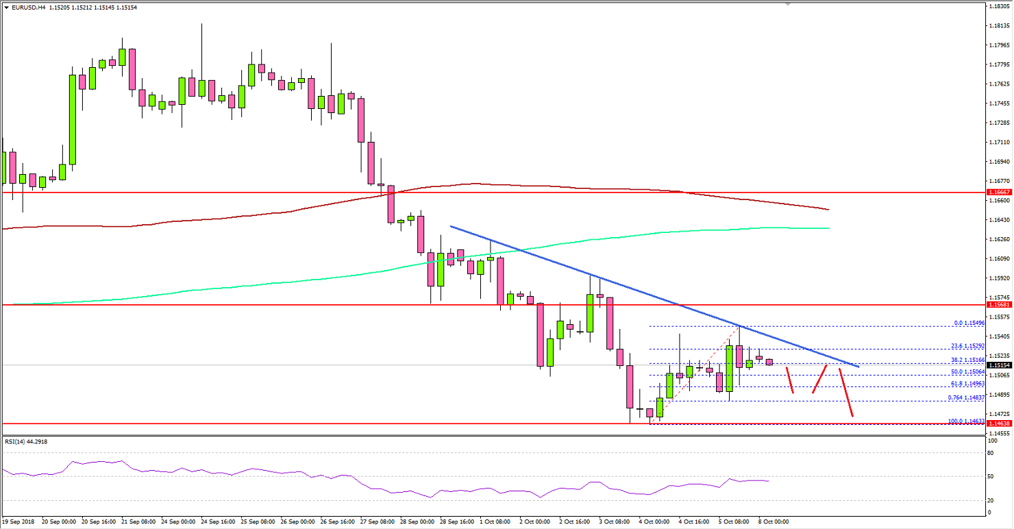 Looking at the 4-hours chart, the pair is clearly under a lot of pressure and is trading well below the 1.1600 and 1.1550 pivot levels. The pair recovered recently from the 1.1463 low and traded above the 1.1500 level.However, the upside move was capped by the 1.1550 level, which was a support earlier and now it is acting as a resistance. Moreover, there is a key bearish trend line in place with resistance at 1.1530 on the same chart.The pair is currently trading below the 1.1520 level and it could continue to move down towards the 50% Fib retracement level of the last wave from the 1.1463 low to 1.1549 high.There could be a short-term upside correction, but gains are likely to be limited unless EUR/USD settles above the 1.1550 resistance level. On the downside, supports are visible near 1.1500 and 1.1460.Fundamentally, the US NFP figure for Sep 2018 was released recently. The market was looking for an increase in jobs by around 185K from August to Sep 2018.However, the result was below than the market forecast as the Nonfarm Payrolls increased 134K, less than the forecast of 185K. On the positive side, the last reading was revised up from 201K to 2017K. Moreover, the unemployment rate declined from 3.9% to 3.7%.The US Dollar was down a bit after the release, but later it recovered and it seems like major pairs like EUR/USD and GBP/USD may continue to move down in the near term.Economic Releases to Watch Today