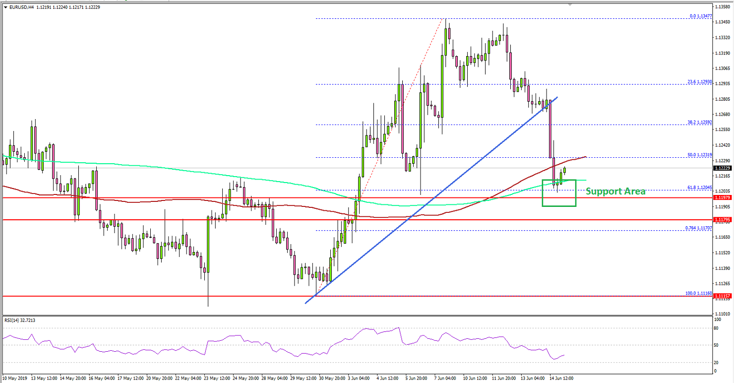 Overall, EUR/USD is trading near the key 1.1200 supportarea. It could either start a fresh increase or decline further towards 1.1150in the near term.