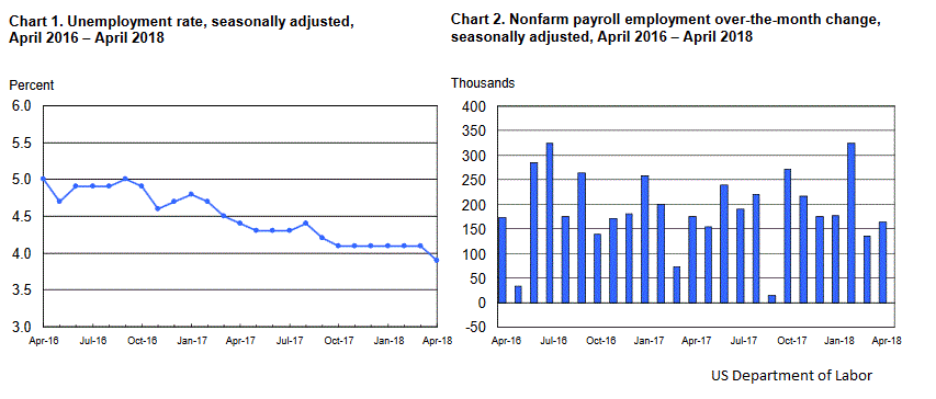 - The US nonfarm payrolls in April 2018 came in at 164K, less than the forecast of 192K.