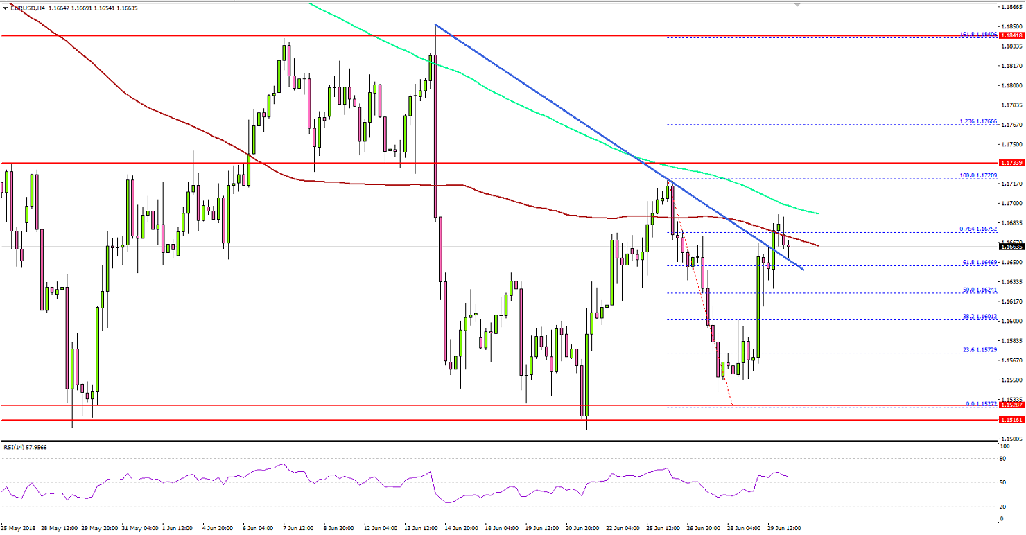 The 4-hours chart of EUR/USD indicates that the pair formed a solid support above 1.1510. It jumped higher and broke the 50% Fib retracement level of the last decline from the 1.1720 high to 1.1522 low.More importantly, there was a break above a connecting bearish trend line with resistance at 1.1650 on the same chart. At the moment, the pair is trading near the 100 simple moving average (red, 4-hours) with positive signs.It may perhaps continue to move higher towards the last swing high at 1.1720. Above this, the next stop for buyers could be the 1.236 Fib extension level of the last decline from the 1.1720 high to 1.1522 low at 1.1766.On the other hand, if the pair corrects lower, it may well find support near the 1.1640 and 1.1600 support levels in the near term.Recently in the Euro Zone, the CPI figure for June 2018 was released by the Eurostat. The market was looking for rise of 2% in the CPI in June 2018 compared with the same month a year ago.