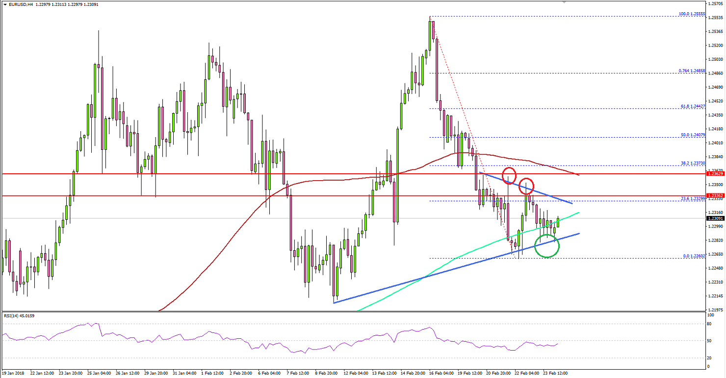 The 4-hours chart suggest that the pair struggled to hold gains above the 1.2400 level and declined below the 100 simple moving average (red, 4-hour). The pair traded close to the 1.2250-60 support area and later is started consolidating losses.On the downside, there is a key bullish trend line forming with support at 1.2265 on the same chart. If there is a break below the trend line and support at 1.2250, there could be more losses toward the 1.2200 level.On the upside, there is a connecting bearish trend line with resistance at 1.2330. Above 1.2330, the pair must break the 1.2350 and 1.2370 resistance levels to move back in the bullish zone.Above 1.2370, the next major resistance is near the 50% Fib retracement level of the last decline from the 1.2555 high to 1.2260 low at 1.2407.This past week, the Euro Zone saw the CPI report for Jan 2018 by the Eurostat. The market was looking for a rise of 1.3% compared with the same month a year ago. The actual result was similar, but the monthly CPI declined 0.9%, compared with the last +0.4%.The report added:The lowest annual rates were registered in Cyprus (-1.5%), Greece (0.2%) and Ireland (0.3%). The highest annual rates were recorded in Lithuania and Estonia (both 3.6%) and Romania (3.4%). Compared with December 2017, annual inflation fell in twenty-one Member States, remained stable in one and rose in six.Overall, the Euro may find it hard to recover above 1.2350 in the near term. On the downside, the 1.2250 and 1.2200 levels are important supports.