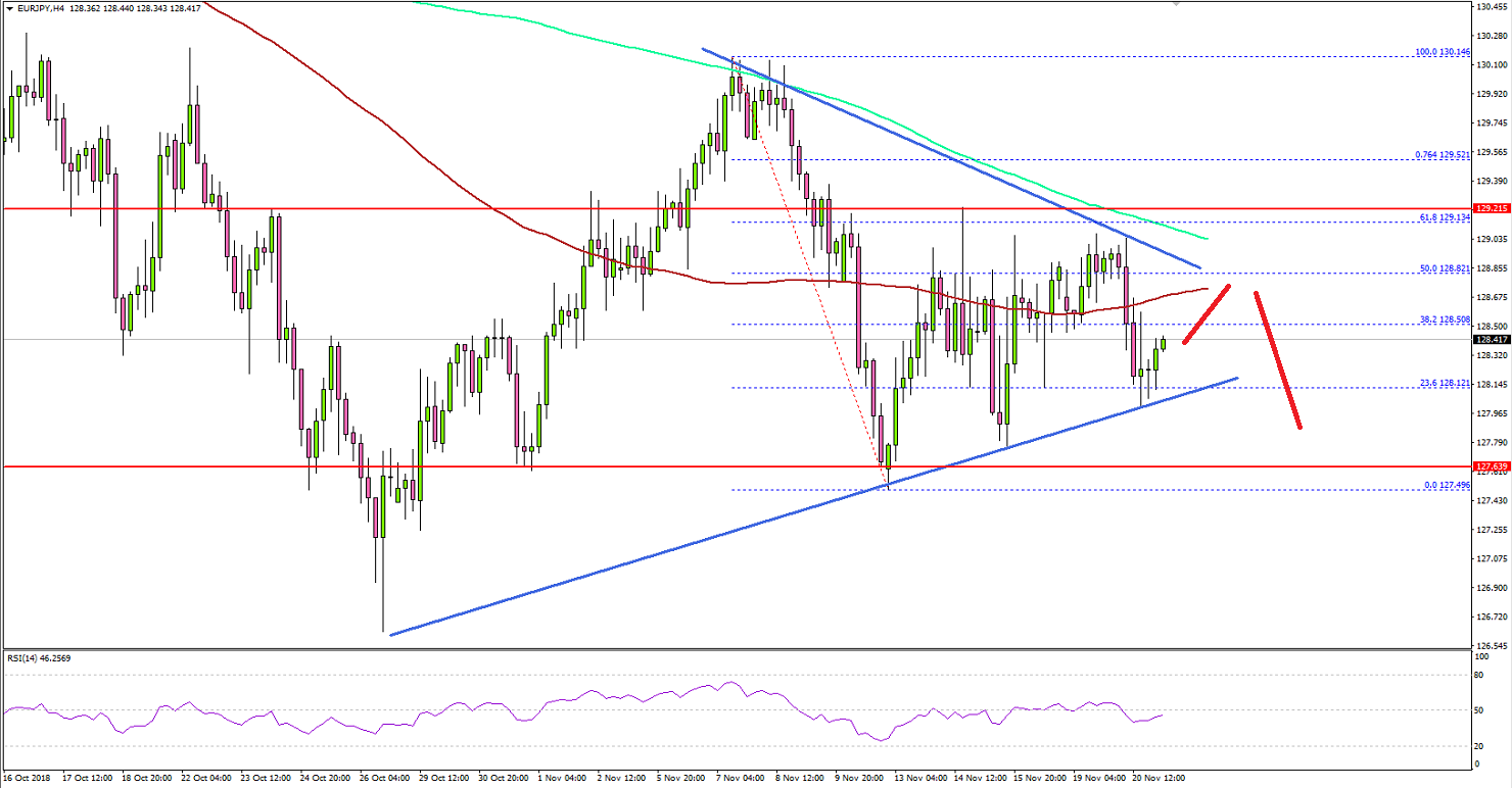 Looking at the 4-hours chart, the pair gained traction above the 128.00 resistance and traded above the 100 simple moving average (red, 4-hours). The upside move was positive since the pair broke the key 128.80 resistance.There was also a break below the 50% Fib retracement level of the last decline from the 130.14 high to 127.49 low. However, the upside move was capped by 129.00 and a connecting bearish trend line.At the outset, it seems like there is a major breakout pattern formed with resistance at 128.85 on the same chart. Therefore, the pair could either break above 129.00 or decline towards 127.50 in the near term.Above 129.00, the pair could trade towards 129.50 and the 76.4% Fib retracement level of the last decline from the 130.14 high to 127.49 low. Above 129.50, buyers could push the pair towards 130.00.Alternatively, if the pair fails to clear the 129.00 resistance, it could decline back towards the 127.50 support area. Further below 127.50, the next major main support is near the 126.80 level.Looking at major pairs, EUR/USD struggled to clear the 1.1450-70 resistance area and GBP/USD is still trading below the key 1.2900 resistance area.Economic Releases to Watch Today