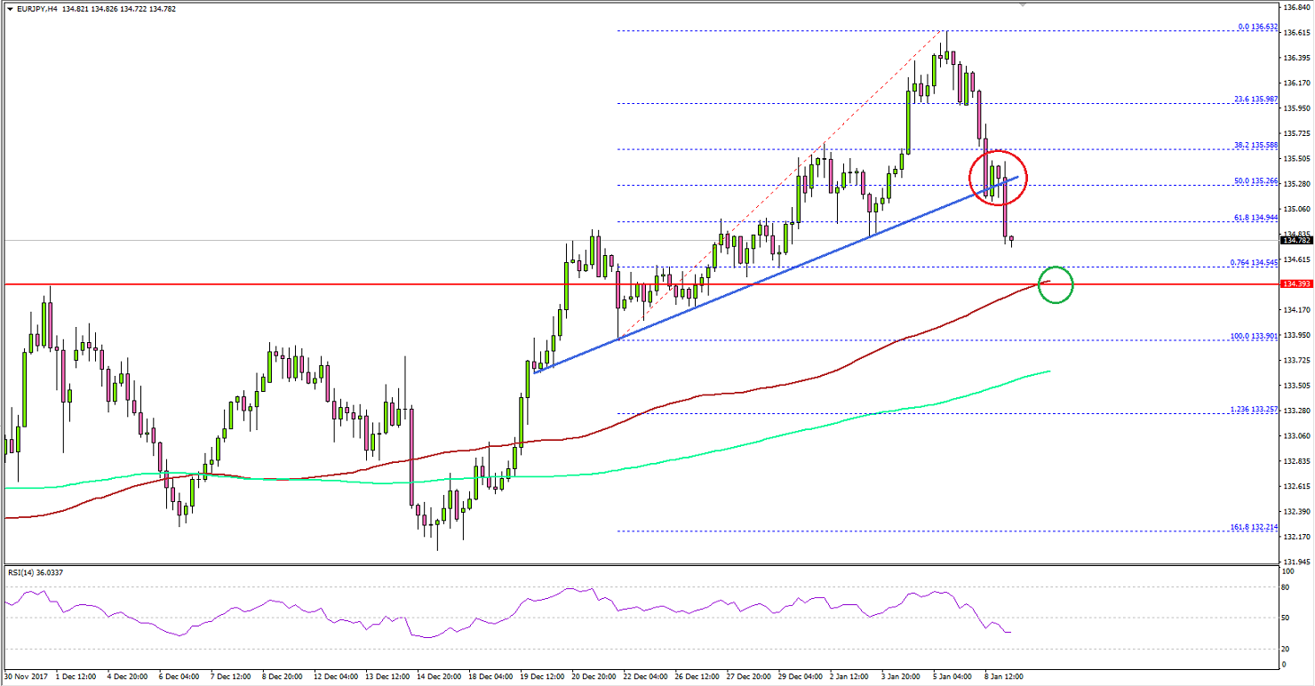- The EUR/JPY pair moved down sharply and broke a crucial bullish trend line with support at 135.25 on the 4-hours chart.