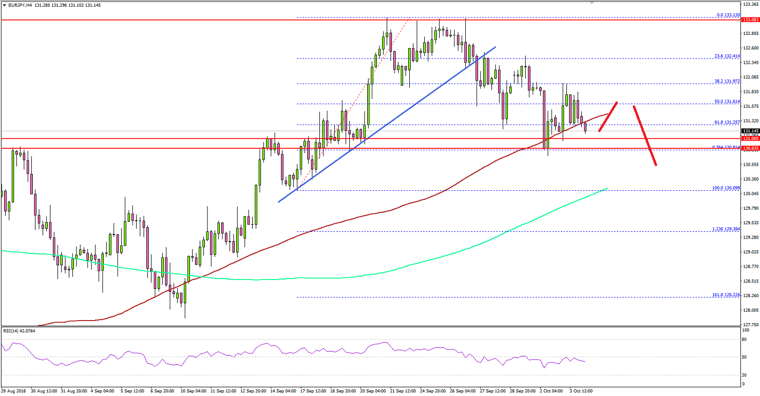 Looking at the 4-hours chart, the pair clearly formed a short-term top at 133.10 and declined towards the 131.00 support area. During the decline, the pair broke the 50% Fib retracement level of the last wave from the 130.09 low to 131.13 high.More importantly, there was a break below a key bullish trend line with support at 132.40 on the same chart. However, the pair found support near 130.80 and it is currently consolidating losses.On the upside, the broken support at 132.00 could act as a resistance. If the Euro buyers push the pair above the 132.00 hurdle, it could revisit the 133.00 resistance.On the other hand, if the pair decline below the recent low, then it may well drop towards the 130.00 support. Below 130.00, the pair is likely to test the 1.236 Fib extension level of the last wave from the 130.09 low to 131.13 high at 129.38.Fundamentally, the US ADP Employment Change figure for Sep 2018 was released recently. The market was looking for an increase of 185K, more than the last 163K.However, the result was above the market forecast as the Private Sector Employment increased by 230K jobs from August to September 2018.