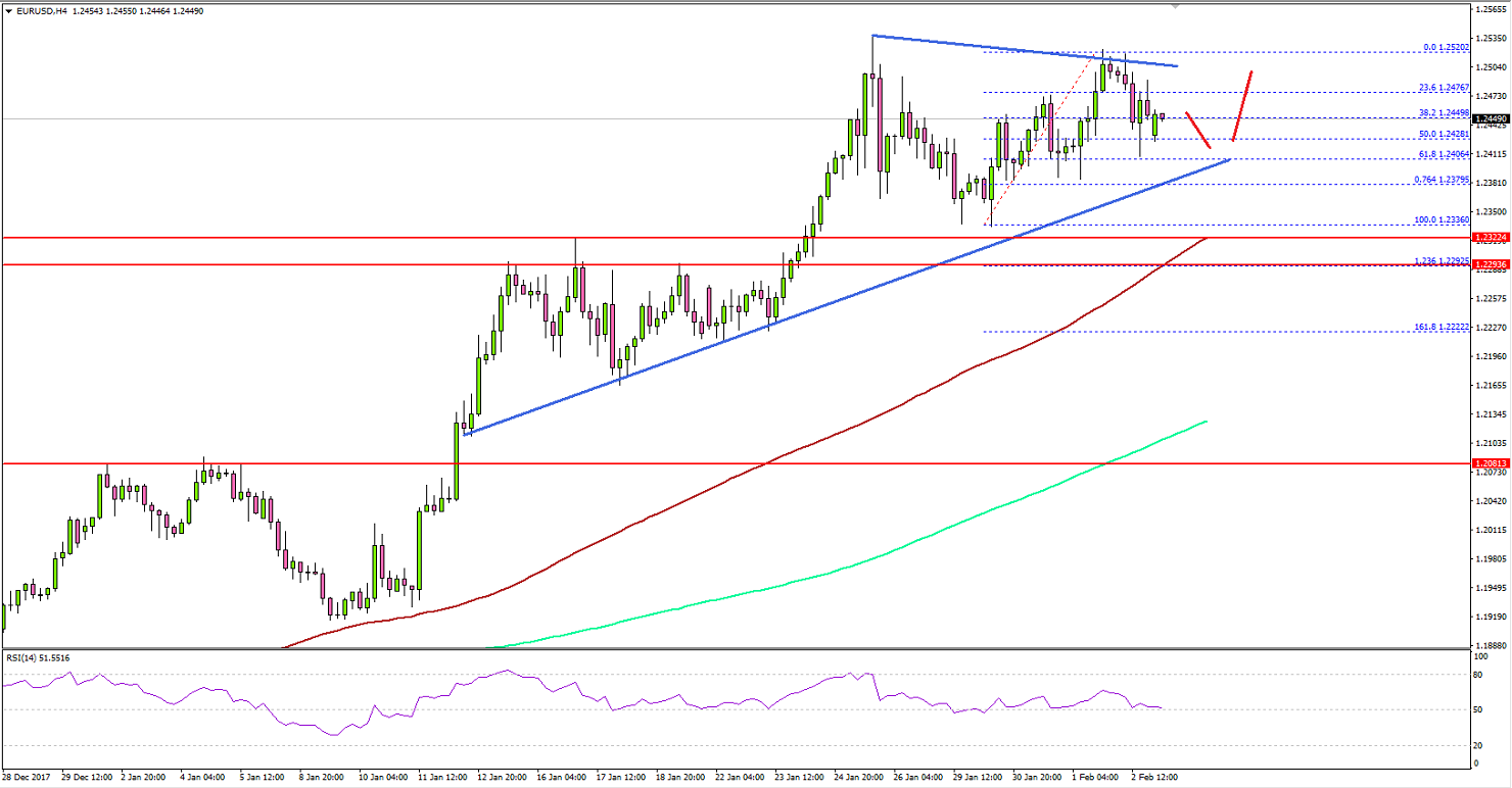 This past week, there was an upside break above 1.2400 in EUR/USD and the pair traded above 1.2500. A new year high was formed at 1.2520 from where a short-term correction was initiated. Recently, the pair broke the 50% Fib retracement level of the last wave from the 1.2336 low to 1.2520 high.However, the current price action is positive as long as the pair is above 1.2400 and 1.2380. There is also a major bullish trend line forming with support at 1.2400 on the 4-hours chart.An intermediate support is near the 61.8% Fib retracement level of the last wave from the 1.2336 low to 1.2520 high at 1.2406. On the upside, there is a connecting bearish trend line forming with resistance at 1.2510.A break above the 1.2510 level and the 1.2520 high could open the doors for more gains. On the flip side, a daily close below 1.2400 may ignite an extended downside move in EUR/USD.This past Friday, the US saw January’s nonfarm payrolls report by the US Department of Labor. The market was looking for an increase of 180K, more than the last 148K.However, the actual result was better since the US NFP came in at 200K. Moreover, the last reading was revised up from 148K to 160K. The report stated:Employment continued to trend up in construction, food services and drinking places, health care, and manufacturing. In January, the unemployment rate was 4.1 percent for the fourth consecutive month. The number of unemployed persons, at 6.7 million, changed little over the month.