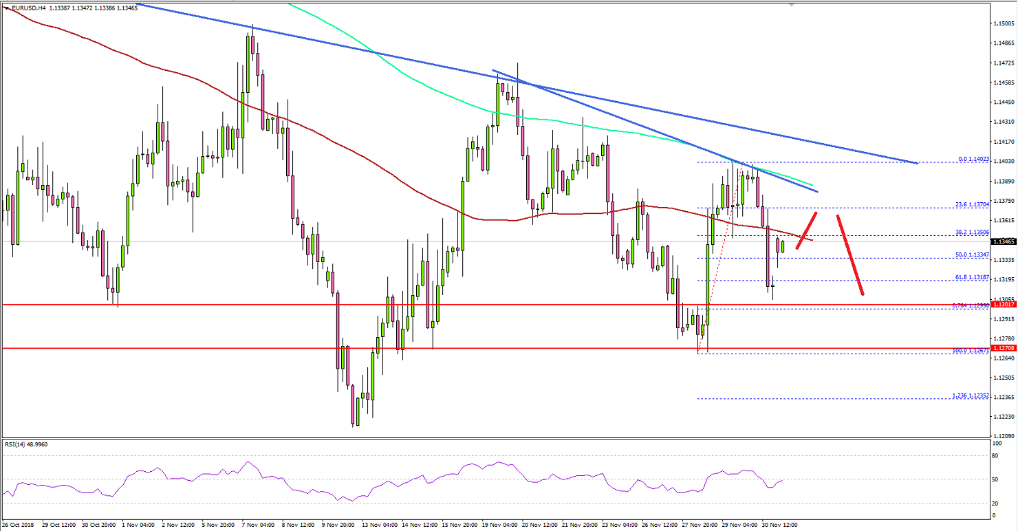 Looking at the 4-hours chart, the pair traded just above the 1.1400 level and tested the 200 simple moving average (green, 4-hours). Sellers defended more gains, resulting in a downside push below the 1.1375 and 1.1350 support levels.The pair even broke the 50% Fib retracement level of the last wave from the 1.1267 low to 1.1402 high. Moreover, there was a close below the 1.1350 level and the 100 simple moving average (red, 4-hours).The pair is clearly under pressure below 1.1350 and it seems like it could decline further. The main support on the downside is at 1.1265, below which the pair could decline towards the 1.1220 support zone.On the upside, there are many hurdles near 1.1350-60 and the 100 SMA. Moreover, there are two major bearish trend lines in place with resistance at 1.1375 and 1.1410 on the same chart. A successful close above 1.1400-1.1410 is needed for buyers to gain strength in the near term.Fundamentally, the Euro Zone CPI (Prelim) for Nov 2018 was released recently by the Eurostat. The market was looking for an increase of 2% in the Euro Zone CPI compared with the same month a year ago.The result was in line with the forecast as the Euro Zone CPI increased 2%, but it was less than the last 2.2%. Moreover, the Core CPI increased 1%, less than the market forecast of 1.1%.Therefore, the EUR/USD pair may continue to struggle to clear the 1.1400 resistance area and it could consolidate above 1.1220 in the short term.Economic Releases to Watch Today