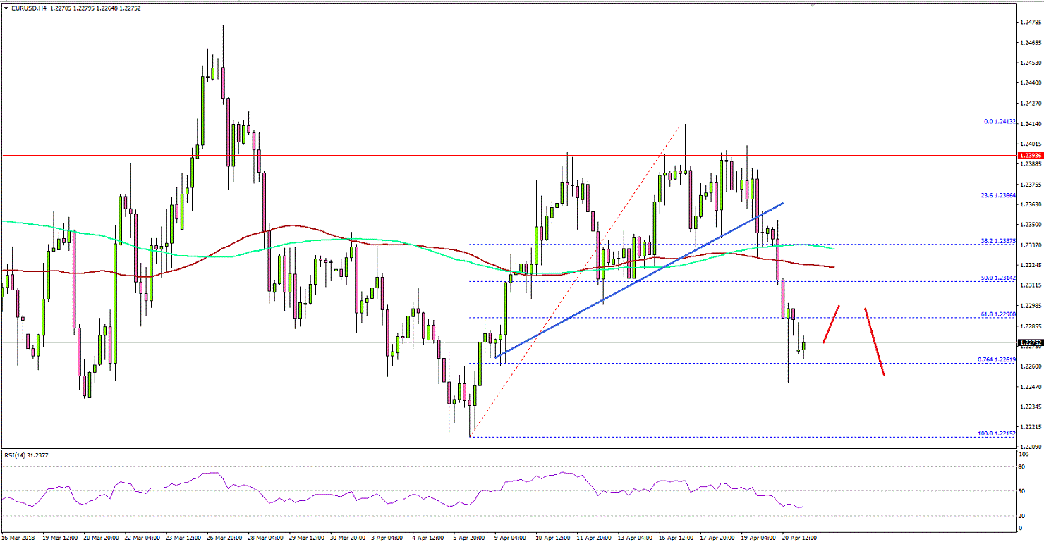 During the decline, there was a break below a major bullish trend line with support at 1.2365 on the 4-hours chart. The pair also broke the 50% Fib retracement level of the last wave from the 1.2215 low to 1.2413 high.Moreover, there was a close below the 100 (red) simple moving average (4-hours) and the 200 (green) simple moving average (4-hours). These are negative signs and suggests that EUR/USD moved into a bearish zone below 1.2360.On the downside, a close below the 76.4% Fib retracement level of the last wave from the 1.2215 low to 1.2413 high could result in further losses. The next support is near the last swing low of 1.2215, followed by 1.2200.If the pair corrects higher from the current levels, it may perhaps face resistances near 1.2320, the 100 (red) simple moving average (4-hours) and the 200 (green) simple moving average (4-hours).Economic Releases to Watch Today