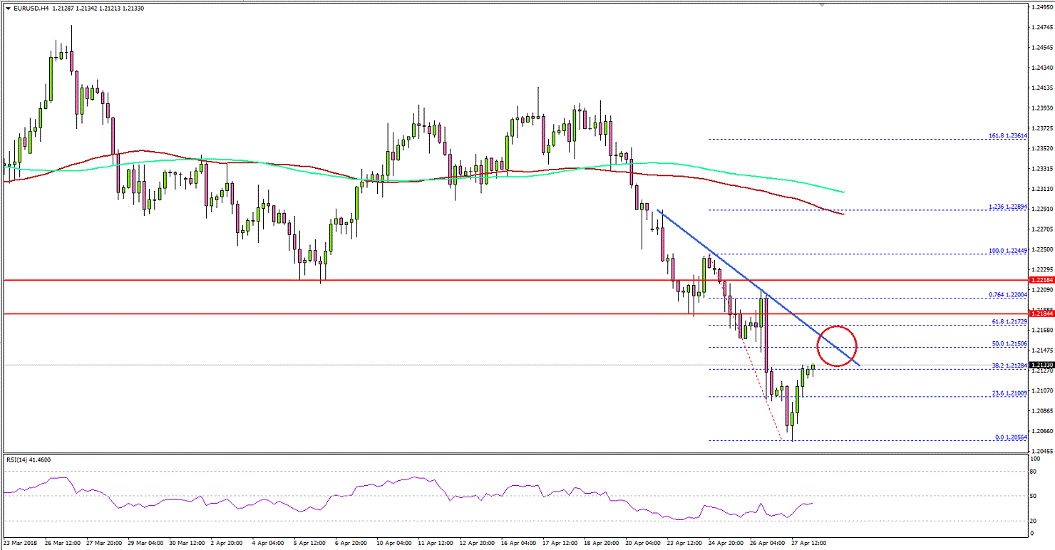 It started an upside correction from the 1.2056 low and moved above 1.2080. There was also a break above the 23.6% Fib retracement level of the last decline from the 1.2244 high to 1.2056 low.However, there are many resistances on the upside around the 1.2150 and 1.2170 levels. There is also a key bearish trend line in place with resistance at 1.2150 on the 4-hours chart.The same trend line resistance is close to the 50% Fib retracement level of the last decline from the 1.2244 high to 1.2056 low. Therefore, a break above the 1.2150 resistance won’t be easy. More importantly, 1.2170-1.2180 area was a support earlier and now it is likely to prevent upsides.The pair is currently trading well below declining 100 (red) and 200 (green) simple moving averages (4-hour), which is a bearish sign. Therefore, if the pair corrects higher, upsides are likely to be capped by 1.2150-1.2170.This past week, the US Gross Domestic Product Annualized reading for Q1 2018 (Prelim) was released by the US Bureau of Economic Analysis. The market was looking for a growth of 2%, less than the last 2.9%.However, the actual result was on the positive side as there was a growth of 2.3% in the GDP. The report added that:Current-dollar GDP increased 4.3 percent, or $211.2 billion, in the first quarter to a level of $19.97 trillion. In the fourth quarter, current-dollar GDP increased 5.3 percent, or $253.5 billion.Overall, the US Dollar is likely to remain in an uptrend versus the Euro, Pound and the Japanese Yen in the near term.