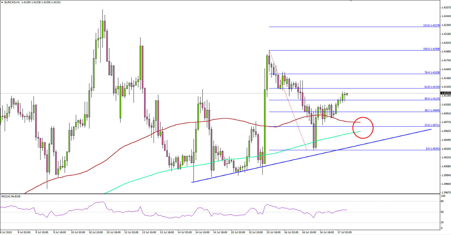 The pair managed to clear the 50% Fib retracement level of the last drop of 1.4190 to 1.4034, and currently heading towards 61.8% Fib level.If it corrects lower from the current levels, then it might find support around the 100 and 200 SMA’s confluence area. Any further downsides could see buyers around the bullish trend line.Canadian CPILater today, there are many economic releases lined up in Canada. The most important one is the Consumer Price Index (CPI), which is a measure of price movements by the comparison between the retail prices of a representative shopping basket of goods and services will be released by the Statistics Canada. The forecast is slated for an increase of 0.3% in June 2015, compared with the preceding month.If there is miss in the outcome, then the Canadian Dollar might come under pressure in the near term.Australian Conference Board leading IndexEarlier during the Asian session, the Australian Conference Board leading Index, which measures future trends of the overall economic activity including employment, average manufacturing workweek and initial claims was released by the Conference Board. The outcome was better when compared with the last decline of -0.3%, as the Australian Conference Board leading Index came in at +0.2%.There was minor upside reaction noted in AUDUSD after the release, as the pair found support around 0.7400.