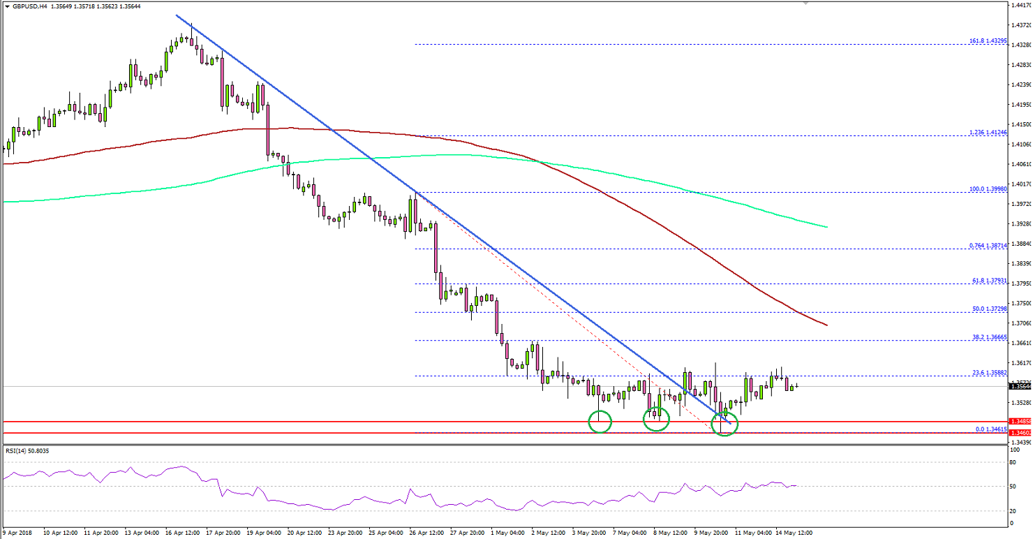 The pair is currently trading in a range and it recently tested the 23.6% Fib retracement level of the last decline from the 1.3998 high to 1.3461 low. During the recent upside, there was a break above a crucial bearish trend line with resistance at 1.3520 on the 4-hour chart of GBP/USD.The pair is currently trading nicely above the 1.3460 pivot level with positive signs. On the upside, the pair faces a major hurdle near 1.3720 and the 50% Fib retracement level of the last decline from the 1.3998 high to 1.3461 low.The 1.3700/20 area is close to the 100 simple moving average (red), which may act as a strong barrier for buyers should the pair continues to move higher.A proper break and close above 1.3700/20 is needed for a bullish continuation. On the flip side, the 1.3460 support zone must hold to prevent further slides. Below 1.3460, the pair could test 1.3400 in the near term.Economic Releases to Watch Today