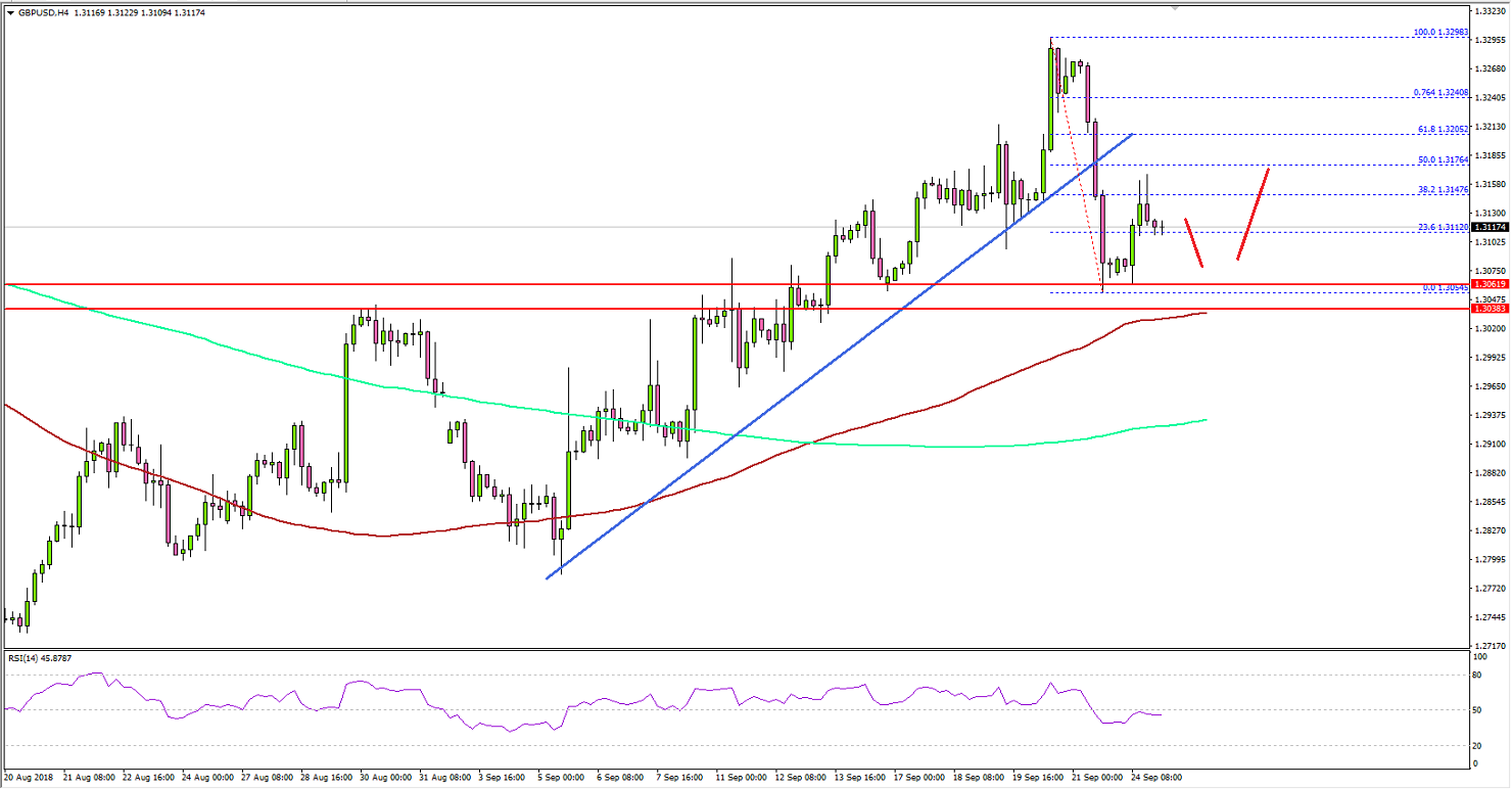 Looking at the 4-hours chart, the pair declined sharply from the 1.3298 swing high and traded below the 1.3200 support. Moreover, there was a break below a bullish trend line at 1.3170, opening the doors for more losses.The pair traded as low as 1.3054 and later started a fresh upward move. It climbed above the 38.2% Fib retracement level of the last decline from the 1.3298 high to 1.3054 low.However, there are many resistances on the upside near the 1.3170 and 1.3200 levels. Moreover, the 61.8% Fib retracement level of the last decline from the 1.3298 high to 1.3054 low is near 1.3205.Therefore, it won’t be easy for buyers to clear the 1.3200 resistance zone. On the downside, the 1.3060-80 region is a crucial support. Below 1.3060, there is a risk of more losses towards 1.2980 and 1.2940.Fundamentally, the Chicago Fed National Activity Index (CFNAI) for August was released yesterday. The market was looking for a decline from the last reading of 0.13 to 0.02.However, the result was better than the forecast as there was no decline and the Chicago Fed National Activity Index remained at 0.18 from the previous revised reading of 0.18.Overall, the GBP/USD pair could correct higher, but a break and close above the 1.3200 level is needed for a push towards the 1.3300 level in the near term.