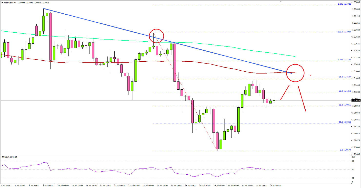 Looking at the 4-hours chart, the pair formed a low near 1.2958 and started a recovery. It bounced back above the 1.3050 resistance and the 38.2% Fib retracement level of the last decline from the 1.3292 high to 1.2958 low. However, the pair is now facing a crucial resistance near the 1.3190-1.3200 zone. There is also a major bearish trend line in place with resistance at 1.3190 on the same chart.The 100 simple moving average (red, 4-hours) is positioned near the trend line at 1.3185. Above the trend line, the next resistance is at 1.3213 and the 76.4% Fib retracement level of the last decline from the 1.3292 high to 1.2958 low. Once the pair closes above the 1.3220 resistance and the 200 SMA (green, 4-hou), there could be more gains towards 1.3300. On the other hand, if the pair declines from the current levels, it may perhaps find support near 1.3050 and 1.3010.Recently in the US, the Existing Home Sales report for June 2018 was released by the National Association of Realtors. The market was looking for a rise of 0.5% in sales compared with the previous month. The actual result was disappointing as there was a decline of 0.6% in the US Existing Home Sales. Moreover, the last reading was revised from -0.4% to -0.7%. However, there was no major impact on the US Dollar and GBP/USD corrected a few points lower.