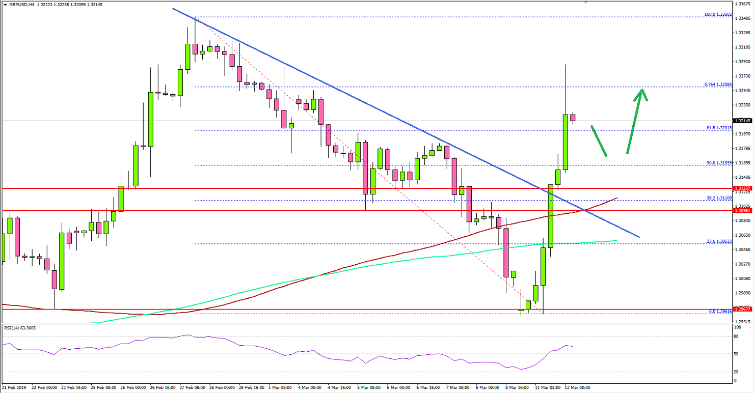 The British Pound started a major decline from the 1.3350 high against the US Dollar. The GBP/USD pair broke the 1.3200 and 1.3120 support levels to enter a bearish zone before buyers appeared near 1.2960.GBPUSD Technical Analysis British Pound US DollarLooking at the 4-hours chart, the pair gained bearish momentum after it broke the 1.3125-1.3120 support and the 100 simple moving average (red, 4-hours). It even tumbled below the 1.3020 and 1.3000 support levels.A new weekly low was formed at 1.2961 and later the pair started a solid upward move. It broke the 1.3055 resistance and the 50% Fib retracement level of the last decline from the 1.3350 high to 1.2961 low.More importantly, there was a break above a strong resistance near the 1.3125 level and a crucial bearish trend line with resistance at 1.3120 on the same chart. Above the trend line, the pair spiked above the next resistance at 1.3200 and the 61.8% Fib retracement level of the last decline from the 1.3350 high to 1.2961 low.A successful close above the 1.3155 resistance means that pair likely moved into the positive zone. If there is a downside correction, the broken resistances at 1.3155 and 1.3125 may act as supports.Fundamentally, the US Retail Sales figure for Jan 2019 was released recently by the US Census Bureau. The market was looking for no change in sales in Jan 2019, compared with the previous month.The result was positive as there was a 0.2% rise in sales in Jan 2019, better than the last decline of 1.6% (revised from -1.2%). Looking at the Retail Sales ex Autos, there was an increase of 0.9%, whereas the market was looking for +0.3%.The report added that: