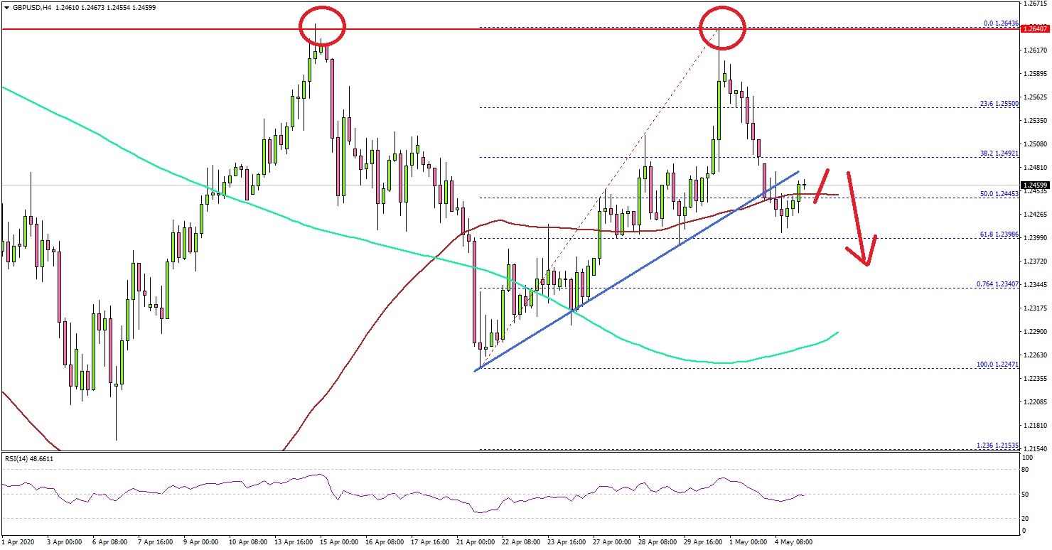 Besides, there was a break below the 1.2500 level, a key bullish trend line at 1.2450, and the 100 simple moving average (red, 4-hours). More importantly, there was a break below the 50% Fib retracement level of the upward move from the 1.2247 low to 1.2643 high.