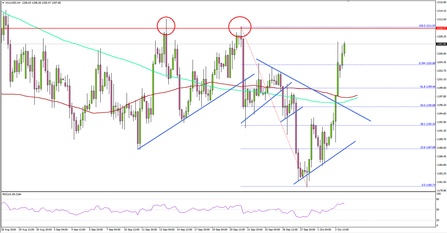 After trading in a broad range above the $1,200 level, gold price started a downside move against the US Dollar. The price tested the $1,180 support and later bounced back above the $1,200 support level.Gold Price Technical AnalysisThe 4-hour chart of XAU/USD indicates that the price was under pressure recently and it moved below the $1,185 support. It traded as low as $1,180 and settled below the 100 simple moving average (red, 4-hours).Later, there was a sharp upward move and the price traded above the $1,200 level and the 50% Fib retracement level of the last decline from the $1,211 high to $1,180 low.The price even settled above the 100 SMA, 200 SMA (green) and the 61.8% Fib retracement level of the last decline from the $1,211 high to $1,180 low. It seems like the price is back in a positive zone and it could continue to move higher.On the upside, there is a strong barrier around the $1,210-1,211 zone, which acted as a resistance on multiple occasions. Buyers need to push the price above $1,211 to accelerate gains towards the $1,220 level.If they fail, there could be a downside correction towards the $1,204 and $1,200 support levels. The most important support is near $1,197 and the 100 SMA.Looking at major pairs like EUR/USD and GBP/USD, there were mostly bearish moves. The Euro declined below the 1.1550 support and the British Pound broke the 1.3025 support area against the US Dollar.