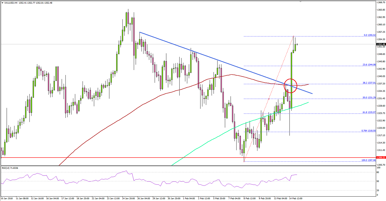 There was a bullish price action in Gold price earlier this week above $1,325 against the US Dollar. Later, the price gained upside momentum and broke a major resistance at $1,335.Gold Price Technical AnalysisMore importantly, there was a break above a crucial bearish trend line with resistance at $1,330 on the 4-hours chart of XAU/USD. The trend line resistance was also near the 100 simple moving average (red, 4-hours).Therefore, the $1,335 level break holds a lot of significance. The price traded as high as $1,355 recently. On the downside, an initial support is around the 23.6% Fib retracement level of the last wave from the $1,307 low to $1,355 high.However, the most important support is near $1,335 (previous resistance). It is also near the 38.2% Fib retracement level of the last wave from the $1,307 low to $1,355 high.In the short term, the price may consolidate above $1,345, with supports at $1,340 and $1,335. On the upside, a break above $1,355 could push the price towards $1,365.