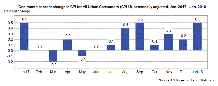 Recently, the US saw two important releases. First, the Consumer Price Index for Jan 2018 by the US Bureau of Labor Statistics. The market was looking for a rise of 0.3% in the CPI compared with the previous month.US CPI Jan 2018The actual result was better, as there was a 0.5% rise in the CPI (MoM). The yearly change came in at 2.1%, more than the forecast of 1.9%, but similar to the last. The report added that: