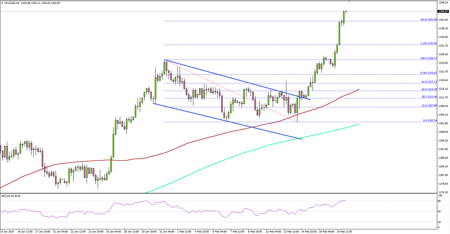 After correcting from the $1,326 swing high, gold price found support near the $1,302 level against the US Dollar. The price started a fresh upward move and broke many resistances near $1,315 and $1,320.Gold Price Technical AnalysisThe 4-hour chart of XAU/USD indicates that the price gained pace once it broke the $1,320 resistance and settled above the 100 simple moving average (red, 4-hours). During the rise, it broke the 61.8% Fib retracement level of the last drop from the $1,326 high to $1,302 low.More importantly, there was a break above a bullish flag with resistance at $1,311, opening the doors for a fresh high above the $1,326 level. Buyers gained control and pushed the price to a new 10-month high above $1,340.The price even spiked above the 1.618 Fib extension level of the last drop from the $1,326 high to $1,302 low at $1,341. In the short term, there could be a downside correction, but dips remain supported above $1,330.On the upside, the next key target for buyers could be $1,350 or the 2.618 Fib extension level of the last drop from the $1,326 high to $1,302 low.Overall, gold price is placed nicely in a strong uptrend and it may continue to rise towards the $1,350 and $1,355 resistance levels. On the other hand, EUR/USD recovered recently, but it failed to break the key 1.1340-1.1350 resonance area. Today’s FOMC Meeting Minutes report holds the key and it could impact gold price and major pairs such as EUR/USD, GBP/USD, AUD/USD and USD/JPY in the near term.