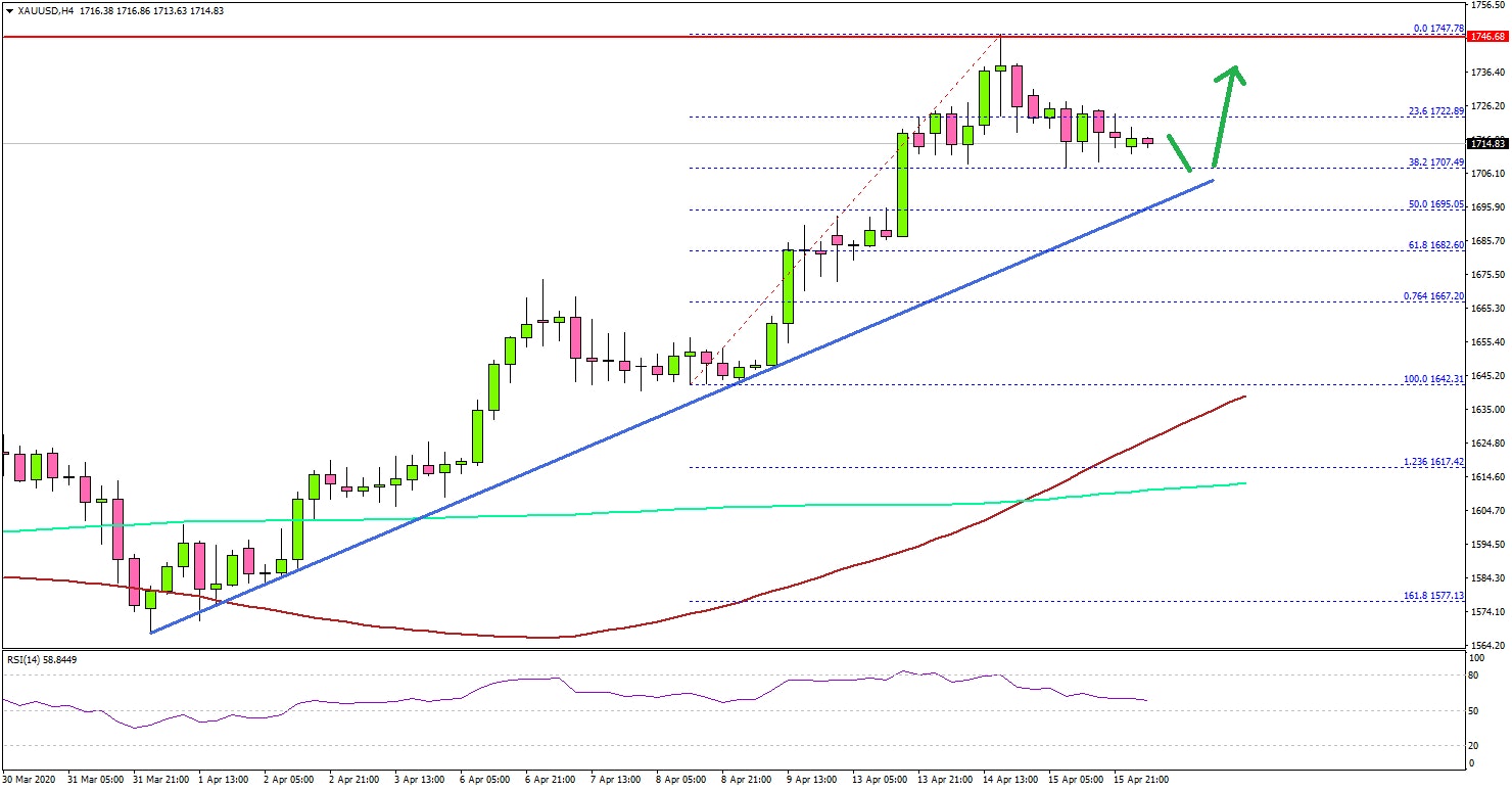 Gold price traded to a new multi-year high $1,747 and it is currently consolidating gains. It corrected below the 23.6% Fib retracement level of the recent rise from the $1,642 swing low to $1,747 high.
