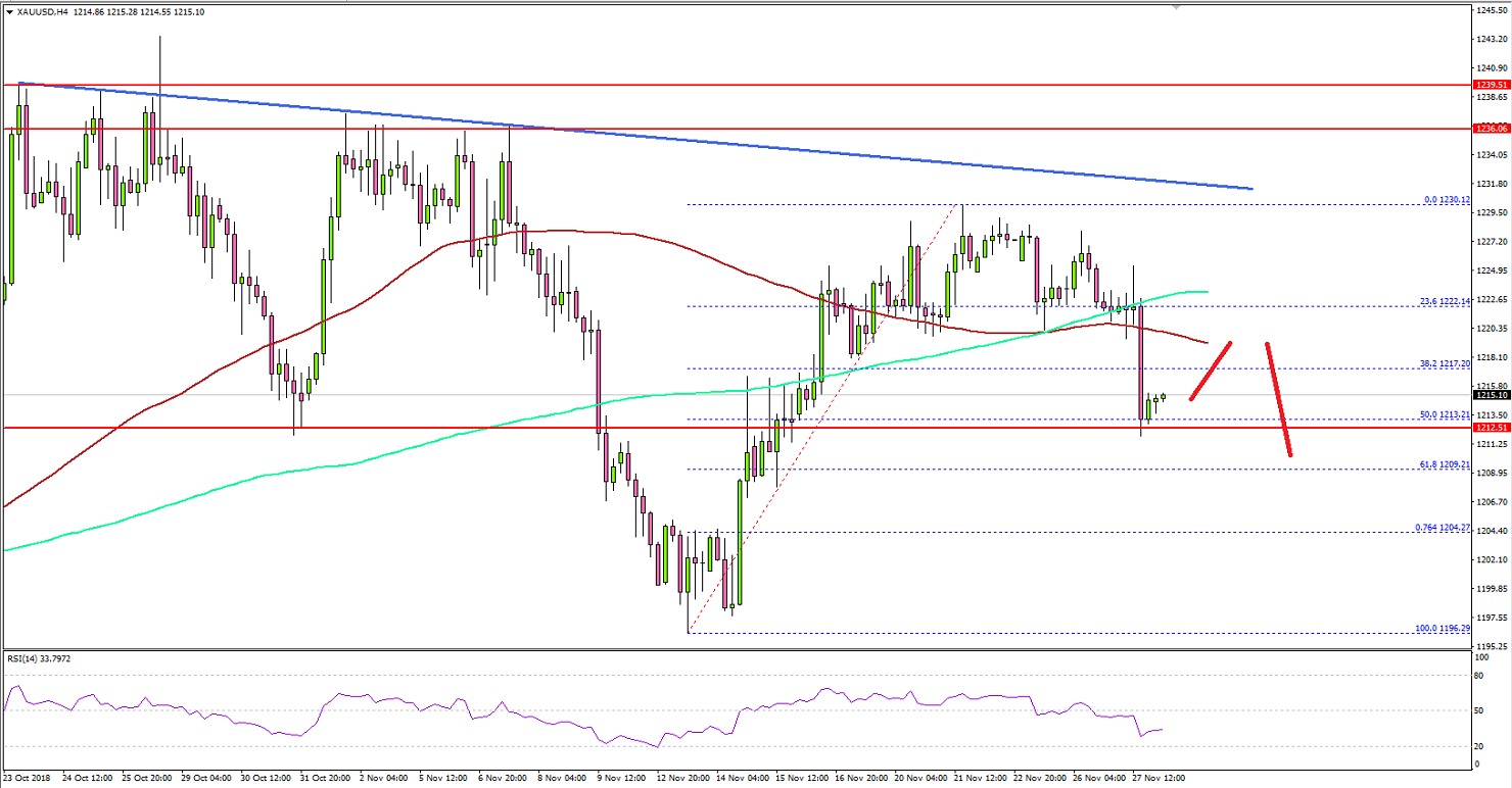 The 4-hour chart of XAU/USD indicates that the price topped near the $1,240 level once, and then at $1,239, $1,236, and finally near $1,230. The recent rally paused near the $1,230 and later the price declined below $1,225.There was also a break below the 38.2% Fib retracement level of the last wave from the $1,119 low to $1,230 high. Since, the price broke the $1,217 support area and settled below the 100 simple moving average (red, 4-hours), there could be more losses towards $1,210.An intermediate support is near $1,213 and the 61.8% Fib retracement level of the last wave from the $1,119 low to $1,230 high. On the upside, an initial resistance is near the $1,230 high.More importantly, there is a key bearish trend line formed with resistance at $1,232 on the same chart. Finally, buyers need to push the price above $1,240 for a sustained upward move. If not, there is a risk of a downside move towards $1,213 and $1,210.Looking at major pairs, EUR/USD failed to stay above 1.1350 and declined. Similarly, there was a downside break below the 1.2800 support in GBP/USD.Economic Releases to Watch Today