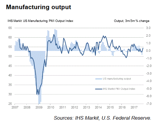 - The US Manufacturing PMI in Oct 2017 (Prelim) posted a rise from the last reading of 53.1 to 54.5.