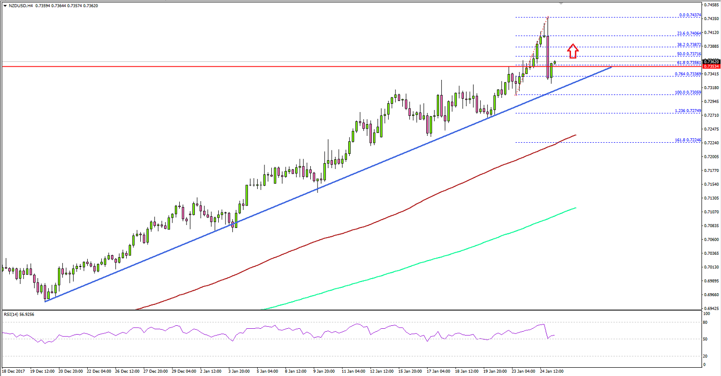 Looking at the 4-hours chart of NZD/USD, there is a strong uptrend in place above the 0.7320 pivot level. The pair recently traded above the 0.7400 level and it looks set for further gains.The pair formed a high at 0.7437 and corrected below the 50% Fib retracement level of the last wave from the 0.7305 low to 0.7437 high. There is a major support forming near 0.7320 and a crucial bullish trend line at 0.7330 on the 4-hours chart.An intermediate support is around the 76.4% Fib retracement level of the last wave from the 0.7305 low to 0.7437 high. The overall price action is positive as long as the pair is above 0.7320.If the current trend remains intact, the pair could continue to move higher and it may even test the 0.7400 resistance. The 4-hours RSI retreated from the overbought levels, but it is currently above the 50 level, which is a positive sign.The market sentiment is very bearish on the US Dollar since other pairs such as EUR/USD and GBP/USD gained a lot of strength recently. EUR/USD was able to move above 1.2350 level and GBP/USD surpassed the 1.4200 level.Moreover, there was a lot of bearish pressure noted on USD/JPY and the pair broke a major support at 110.00, which is a key negative sign.To sum up, the greenback is under pressure and pairs like EUR/USD, GBP/USD and NZD/USD may continue to rise.