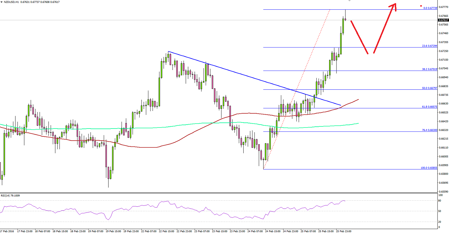 The New Zealand dollar traded higher and tested the 0.6770 resistance area against the US Dollar. There was a bearish trend line on the hourly chart, which was broken by buyers to take the pair higher in the near term.