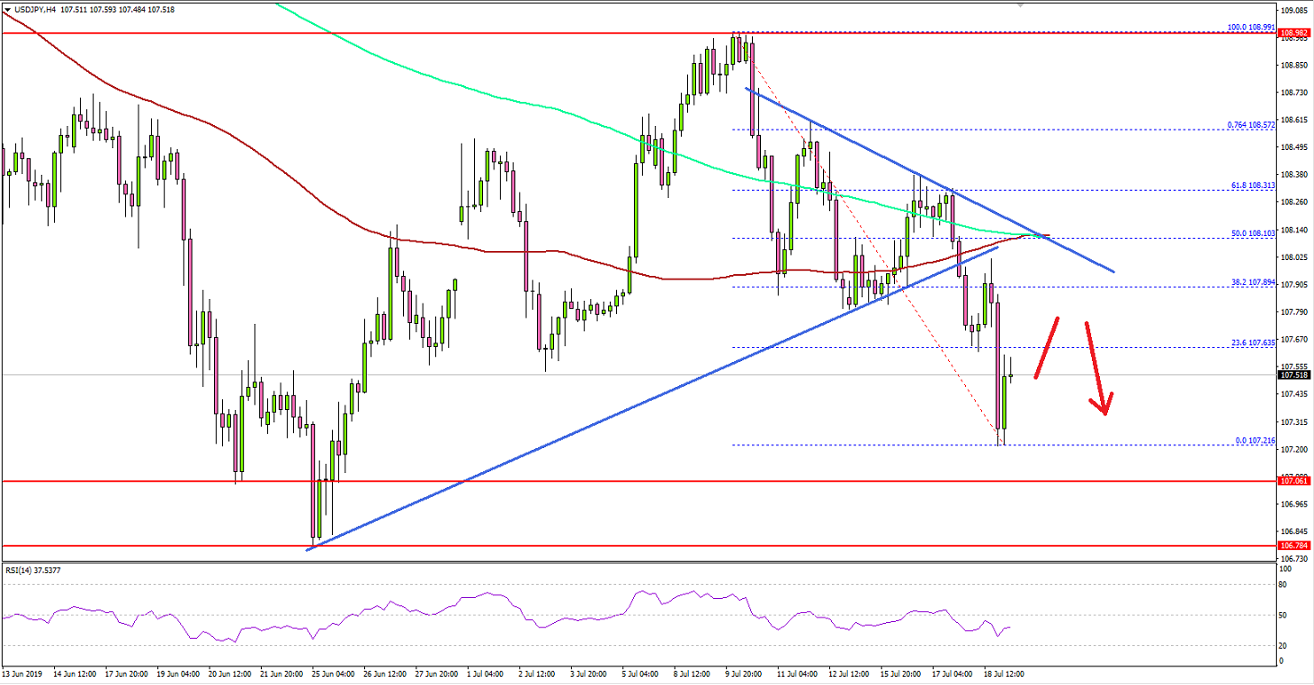 The US Dollar failed to surpass the 109.00 resistance level against the Japanese Yen. As a result, the USD/JPY pair started a bearish wave and broke the 108.00 and 107.80 support levels.