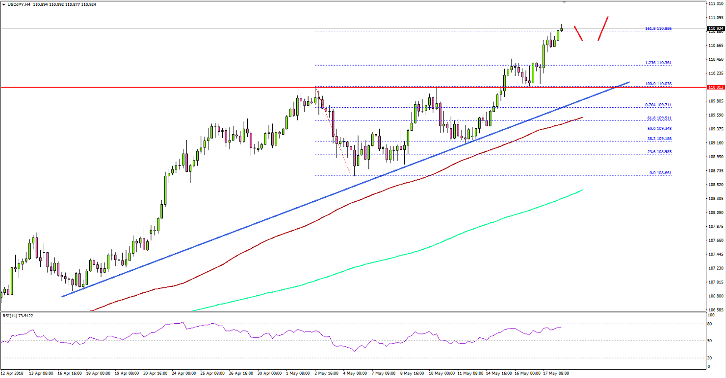 Looking at the 4-hours chart, there is a clear uptrend in place from the 109.00 support zone. The pair followed a bullish path and moved above the 1.236 Fib extension of the last decline from the 110.03 high to 108.66 low.It settled above 110.00 and is currently poised to extend gains. It even tested the 1.618 Fib extension of the last decline from the 110.03 high to 108.66 low at 110.88.On the downside, there are many supports around the 110.00 level. There is also a major bullish trend line forming with support at 109.80 on the 4-hours chart of USD/JPY. Moreover, the 100 simple moving average (4-hour, red) is positioned below the trend line with a bullish angle at 109.50. Therefore, if the pair corrects lower, it is likely to find bids near 110.10, 110.00 and 109.80. Recently, the US Initial Jobless Claims for the week ending May 12, 2018 was released by the US Department of Labor. The market was looking for a rise in claims from 211K to 215K.The actual result was disappointing as there was a rise in claims to 222K. The report added that: