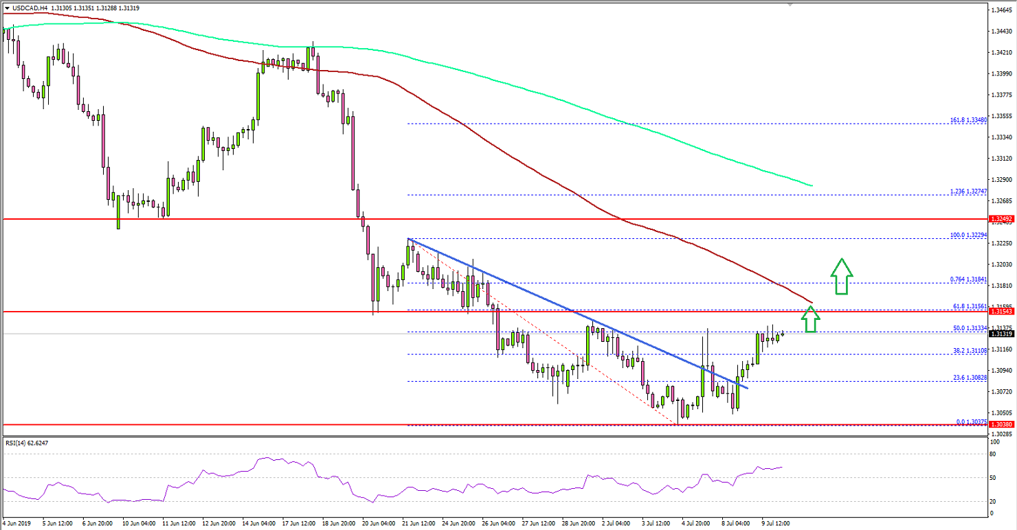• USD/CAD traded above a bearish trend line withresistance near 1.3080 on the 4-hours chart.