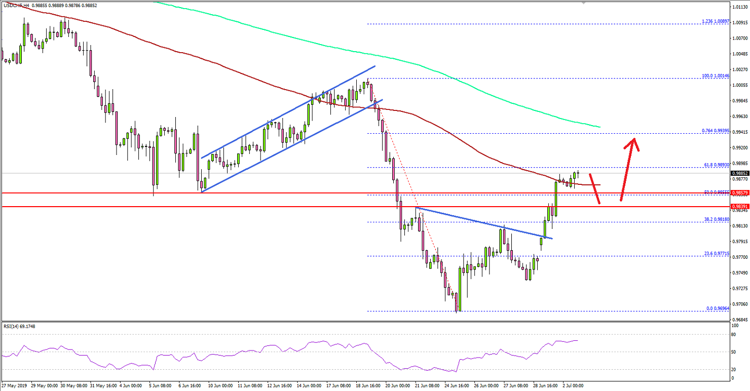 - USD/CHF traded above a bearish trend line withresistance near 0.9790 on the 4-hours chart.