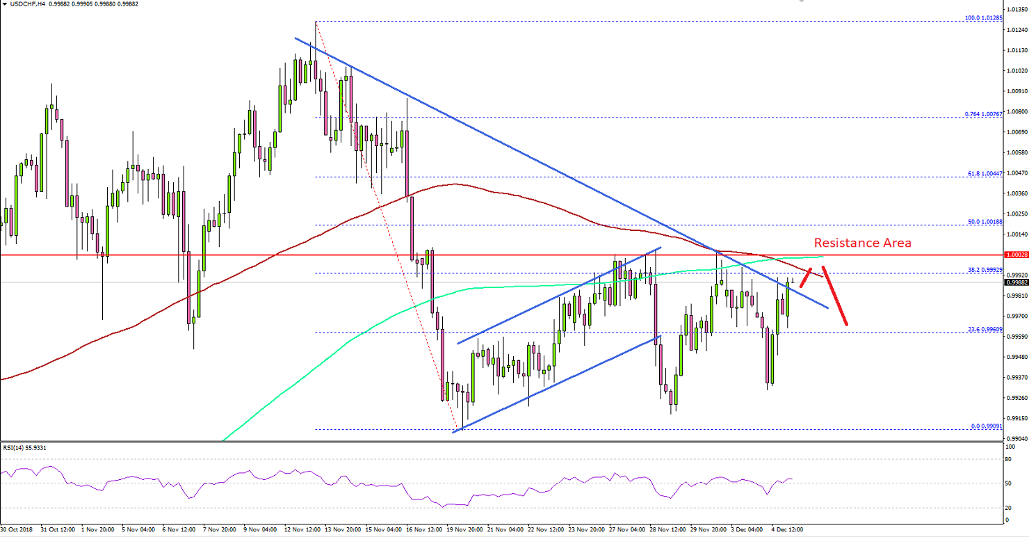 - There is a major bearish trend line formed with resistance near 0.9980 on the 4-hours chart of USD/CHF.