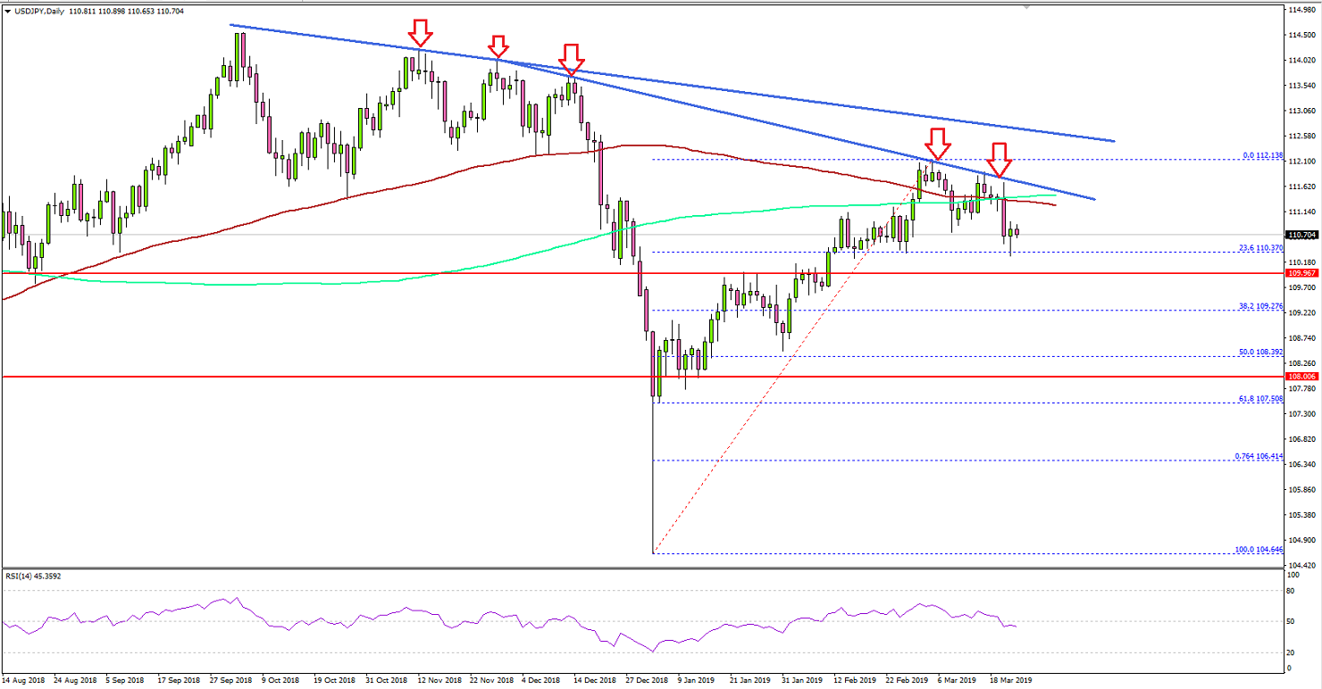In January and February 2019, the US Dollar followed a solid bullish path above 108.00 against the Japanese Yen. The USD/JPY pair traded above 110.00, but it found a strong resistance above 112.00 and later started a downside correction.