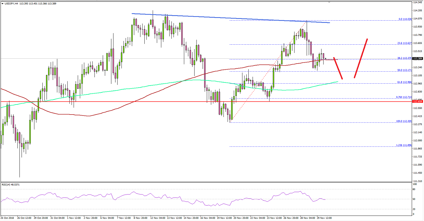 The US Dollar gained bullish momentum this past week and traded above 113.40 against the Japanese Yen. However, the USD/JPY pair failed again to break the 114.00 resistance area and corrected lower recently.