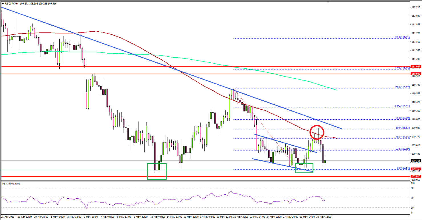 - USD/JPY failed near 109.90 and remained below akey bearish trend line on the 4-hours chart.