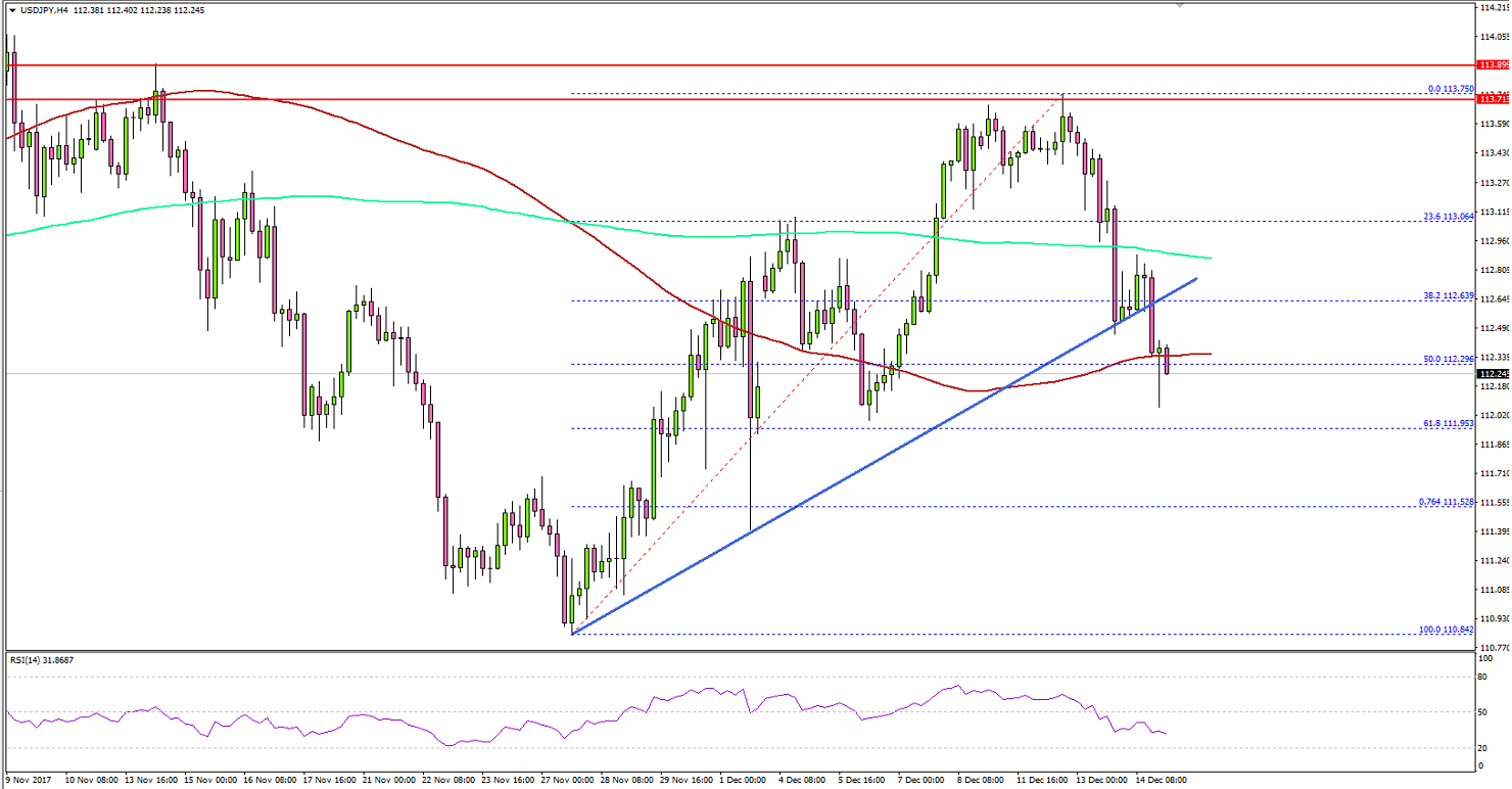 - USD/JPY also broke a crucial support area near 112.30 and a bullish trend line on the 4-hours chart.