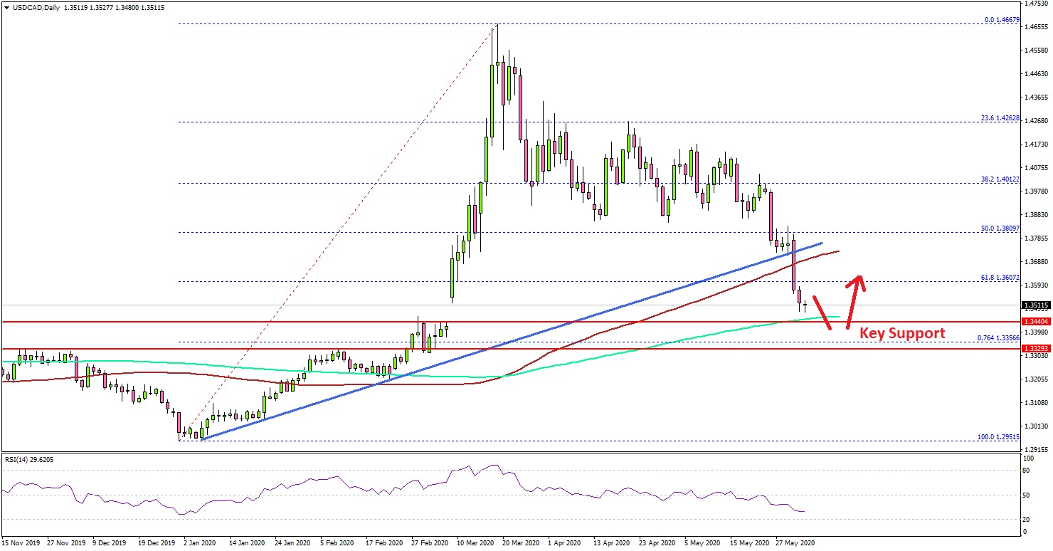 After forming a major top near the 1.4667 level in March 2020, the US Dollar started a significant decline against the Canadian Dollar. USD/CAD broke many supports near 1.4000 to move into a bearish zone.