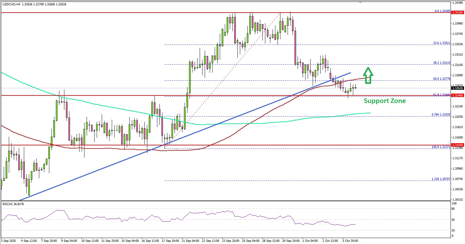 Looking at the 4-hours chart, the pair traded below the 1.3350 and 1.3300 support levels. There was also a break below a key bullish trend line with support at 1.3275.